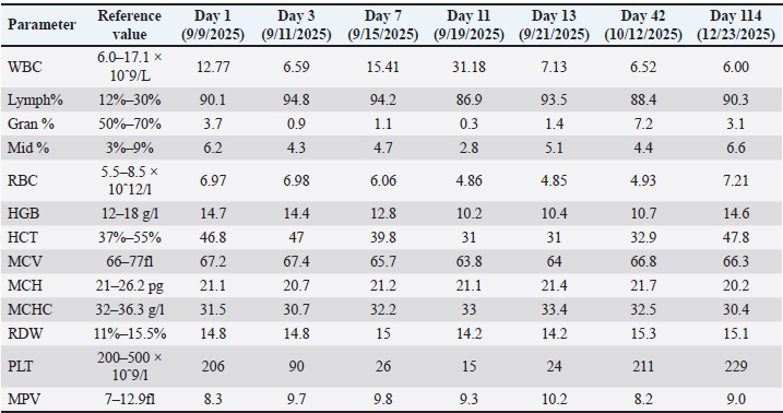 Table 3. Treatment timeline and key diagnostic findings of a PCR-confirmed canine rickettsiosis case in Cebu, Philippines.