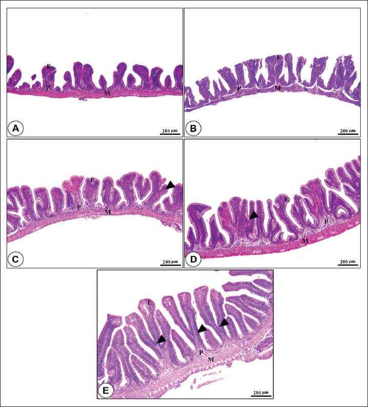 Fig. 2. Photomicrograph of H&E-stained panel of the anterior part of intestine in fenugreek oil dietary enrichment at 0 g (A), 0.5 g (B), 1.0 g (C), 2.0 g (D) and 4.0 g (E) groups showing intestinal villi lined by simple columnar epithelium of lamina epithelialis (E), lamina propria (P), and lamina muscularis (M) in addition to the presence of long branched intestinal villi in all fenugreek oil-supplemented groups.