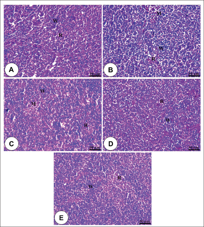 Fig. 4. Photomicrograph of the H&E-stained panel of the spleen of fenugreek oil dietary enrichment at 0.0 g (A), 0.5 g (B), 1.0 g (C), 2.0 g (D), and 4.0 g (E) groups showing interconnecting cords of red pulp (R) and white pulp (W) in addition to melanomacrophage (M) with an increase in the density of white pulp in fenugreek oil-containing groups. Table 6. Morphometric analysis of the intestine of O. niloticus of different groups.