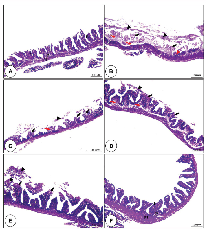 Fig. 5. H&E-stained panel of the intestine in the control group (0.0 g fenugreek oil [A] group) showing intact lamina epithelialis of intestinal villi (E), lamina propria (P), and lamina muscularis (M). Group (B) represents the 0.0 g FO group challenged with A. hydrophilla showing severe degeneration and sloughing of the lamina epithelialis (black arrowheads), loss of the entire epithelial covering of the alveoli (black arrows), necrosis of the crypt epithelial covering (red arrowheads), and edema in the lamina propria (red arrows). Groups C, D, and E represent the FO supplementation at 0.5, 1, and 2 g/kg diet and challenged with A. hydrophilla showing sloughing of the lamina epithelialis apical part of intestinal villi (black arrow heads), exposure of the apical part of the lamina propria (black arrows), and edema in the lamina propria (red arrows). Group F represents 4.0 g FO and challenged with A. hydrophilla showing intact lamina epithelialis of intestinal villi (E), lamina propria (P), and lamina muscularis (M). The hepatopancreas of Nile tilapia fingerlings following A. hydrophila infection showed severe vacuolar degeneration and necrotic changes in both hepatic and pancreatic cells in the non-supplemented group. These harmful effects were gradually diminished with dietary fenugreek oil enrichment in a dose-dependent pattern. However, the hepatic cells showed microsteatosis in dietary supplementation with 2.0 and 4.0 g of fenugreek oil (Fig. 6).