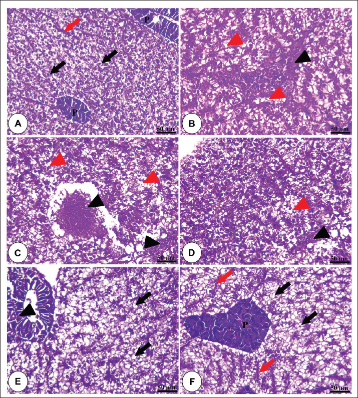 Fig. 6. H&E-stained panel of hepatopancreas of the control group (0.0 g fenugreek oil [A] group) showing intact hepatocytes (black arrows), blood sinusoids (red arrows), and pancreatic acini (P). Group (B) represents the 0.0 g FO group challenged with A. hydrophilla showing severe necrosis of hepatic and pancreatic tissue (black arrowheads) and vacuolar degeneration of hepatocytes (black arrowheads). Groups C, D, and E represent the FO supplementation at 0.5, 1, and 2 g/kg diet and challenged with A. hydrophilla showing necrosis of hepatic and pancreatic tissue (black arrow heads) and vacuolar degeneration of hepatocytes (black arrow heads). Groups E and F were administered 2.0 and 4.0 g FO, respectively, and were challenged with Aeromonas hydrophila showing mild degenerative changes in pancreatic acini (black arrow head) in 2 g fenugreek oil, in addition to the presence of marked steatosis of hepatocytes (black arrows) and intact blood sinusoids (red arrows). In the non-supplemented group (0.0 g FO/kg diet), the splenic parenchyma showed severe congestion and hemolysis inside splenic blood vessels, degenerative changes of splenic cells, perivascular edema, and depletion of white pulp in response to A. hydrophila infection. These pathological lesions were markedly diminished in a dose-dependent concentration in all FE-enriched groups (Fig. 7).