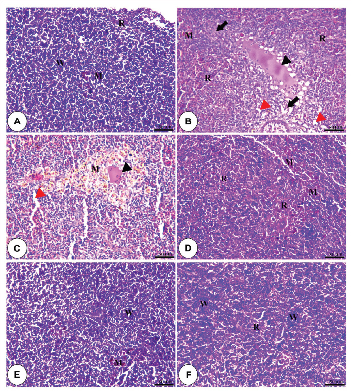 Fig. 7. Photomicrograph of the H&E-stained panel of the spleen of the control group (0.0 g fenugreek oil [A] group) showing interconnecting cords of red pulp (R) and white pulp (W) beside the presence of a melanomacrophage (M). The presence of fenugreek oil at 0.0 g (B), 0.5 g (C), 1.0 g (D), 2.0 g (E), and 4.0 g (F) and A. hydrophilla challenge showing hemolysis inside splenic blood vessels (black arrowhead), degeneration of splenic tissue (black arrows), perivascular edema (red arrowheads), and increased melanomacrophage (M). Table 7 displays the histopathological scoring of detected lesions in the intestine, hepatopancreas, and spleen tissue following A. hydrophila infection. The nonsupplemented (control) group recorded the highest scores for all reported lesions in all examined tissues. These scores decreased, in a dose-dependent manner, with the highest fenugreek oil supplementation level (4.0 g/kg diet) nearly had negative scores for all assessed tissues. Table 7. Histopathological scoring of intestinal, hepatopancreatic and splenic lesions challenged by A. hydrophila.