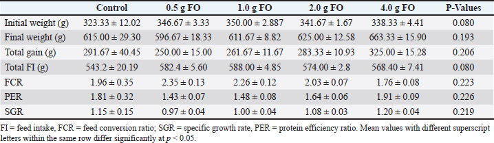AbstractBackground: Aeromonas hydrophila is an opportunistic pathogen that causes Motile Aeromonad Septicemia (MAS) with significant losses in Nile tilapia farms. Because of its bioactive compounds that enhance immunity and antioxidant capacity, dietary supplementation with fenugreek oil can effectively mitigate A. hydrophila-associated losses. Aim: This study aimed to explore the hematobiochemical, immune, antioxidant, and histopathological impacts of dietary fenugreek oil (FO) in Nile tilapia under normal culturing plus A. hydrophila infection. Methods: Approximately 300 Nile tilapia fingerlings (15.00 ± 3.00 g) were randomly distributed into five clusters, designated as FO-0 (control), FO-0.5, FO-1.0, FO-2.0, and FO-4.0 in which 0.0, 0.5, 1.0, 2.0, and 4.0 g FO/kg diet were supplemented, respectively. Diets were offered for 8 weeks at a 3% feeding rate. After 8 weeks of FO feeding, blood and tissue samples were collected to evaluate the impact of FO feeding under normal conditions. Then, fish in each treatment were injected (intra-peritoneally) with 0.2 ml of A. hydrophila suspension and monitored for 2 weeks for any mortality. Then, blood and tissue were sampled. Results: Final body weight, gain, feed conversion ratio, specific growth rate, and protein efficiency ratio in all FO-enriched groups displayed numerical increases relative to the control group (P > 0.05), peaking at 4.0 g FO/kg diet. FO dietary supplementation significantly improved antioxidant capacity, reflected by increases in superoxide dismutase and catalase activities with lowered malondialdehyde levels, particularly at 2.0–4.0 g FO/kg diet, both under normal and A. hydrophila challenge. Moreover, the innate immunity biomarkers lysozyme activity, and phagocytic activity and index exhibited marked dose-dependent improvements, both under normal, and following A. hydrophila exposure (P < 0.05). Biochemically, total protein and globulin concentrations were significantly elevated with reduced urea concentration and hepatic enzymes activities in all FO-treated groups (P < 0.05). Moreover, all FO-supplemented groups showed improved histopathological features of the intestine, liver, and spleen with mitigation of the A. hydrophila-degenerative changes. Conclusion: Thus, FO could be used as a promising natural additive in Nile tilapia diet, particularly at 2.0–4.0 g/kg diet, to enhance hemato-biochemical profile, antioxidant defense, innate immunity, tissue integrity, and resistance against A. hydrophila, assuring sustainable and health-oriented aquaculture activities. Keywords: Nile tilapia, Fenugreek oil, Antioxidant status, Innate immunity, Histopathological features, A. hydrophila. IntroductionNile tilapia (Oreochromis niloticus) is a cornerstone fish species in global aquaculture. It is characterized by a steadily increasing production and adaptability to many challenges, such as infection, and suboptimal feed utilization (Khalafalla et al., 2020; Abdo et al., 2024). These challenges cause economic losses in Nile tilapia, particularly with intensified farming and global environmental changes (Hamed et al., 2024). Therefore, it is crucial to explore new natural feed additives that enhance fish’s performance and boost immunity, thereby avoiding the use of antibiotics and alleviating their associated antibiotic resistance challenge (Diab et al., 2023). Medicinal herbs have gained attention for their promising impacts and prebiotics characteristics in improving fish growth, feed utilization, physiology, and susceptibility to diseases (Gabriel, 2019; Kuebutornye and Abarike, 2020; Ahmadifar et al., 2021; Abaho et al., 2022). Several studies have reported the effectiveness of several medicinal plants in improving fish growth performance, biochemical responses, and resistance to diseases compared with antibiotics (Awad and Awaad, 2017; Gabriel, 2019; Kuebutornye and Abarike, 2020; Ahmadifar et al., 2021; Abaho et al., 2022). Fenugreek (Trigonella foenum-graecum) is a medicinal plant that belongs to the family Fabaceae, and its seeds or extracts have many beneficial properties (Bahmani et al., 2016). Its seeds contain various bioactive compounds, including alkaloids, sapogenins, and steroids, which induce valuable pharmacological effects, such as anti-inflammation and antimicrobial effects, and reduce triglyceride and cholesterol levels (Diab et al., 2023). In Nile tilapia, fenugreek seeds and extract have been extensively explored, demonstrating increases in body weight gain, improved in feed conversion ratio, and increased resistance and survival against pathogens such as Aeromonas hydrophila (Moustafa et al., 2020; Diab et al., 2023). Fenugreek oil, particularly Fenugreek essential oil, contains concentrated nutritive and bioactive compounds with potentially higher bioavailability for lipophilic compounds, such as essential fatty acids and volatile compounds, compared with the seed and extract (Akbari et al., 2019). Despite its concentrated content of bioactive compounds, fenugreek oil remains unexplored, offering distinct advantages over seeds and extracts, representing a key research gap. Thus, in this study, we hypothesized that dietary supplementation of Nile tilapia with fenugreek essential oil would add extra nutritional value that would enhance growth indices and hematobiochemical profile, and excel in infection control over dietary Fenugreek seeds or extract. Therefore, this study aimed to explore the impact of dietary supplementation of fenugreek essential oil on Nile tilapia growth performance, physiological and biochemical responses, and resistance to A. hydrophila infection. Materials and methodsPreparation of experimental diets, fish sources, and fish managementIn this study, five experimental diets were formulated to be both isonitrogenous and isocaloric, with 300 g/kg of crude protein and 12.6 MJ/kg of digestible energy according to the guidelines and nutritional requirements set by the National Research 
