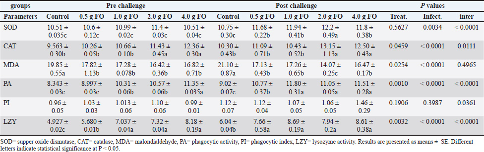 Effect of dietary fenugreek oil supplementation on antioxidant and immune-related biomarkers of Nile tilapia fingerlingsThe assessment of antioxidant enzyme activity and immune-related indices in Nile tilapia fingerlings following FO supplementation is illustrated in Table 3. Superoxide dismutase activity was significantly enhanced in the FO-supplemented groups, particularly after A. hydrophila challenge, with the highest activity reported in the 2.00 g FO/kg diet (12.20 ± 0.49) and 4.00 g FO/kg diet (11.80 ± 0.38), and exposed to A. hydrophila challenge compared to the other groups (P < 0.05). Catalase activity also increased in a dose-dependent pattern, with the highest activity reported at the 2.00 and 4.00 g of FO/kg diet supplementation levels in both normal and following the A. hydrophila challenge (P < 0.05). The improved activities of antioxidant enzymes were correlated with a significant reduction in the lipid peroxidation indicator, malondialdehyde (MDA), in all FO-supplemented groups, particularly at 2.00 and 4.00 g of FO/kg diet under normal culturing conditions. The MDA level significantly increased in the tilapia fingerlings exposed to A. hydrophila infection without FO dietary supplementation (control), which interestingly reduced in the FO-supplemented groups and exposed to A. hydrophila infection, particularly at 2.00 g of FO/diet (P < 0.05). Table 3. Antioxidant enzyme activity and innate immune response biomarkers in response to FO dietary supplementation.