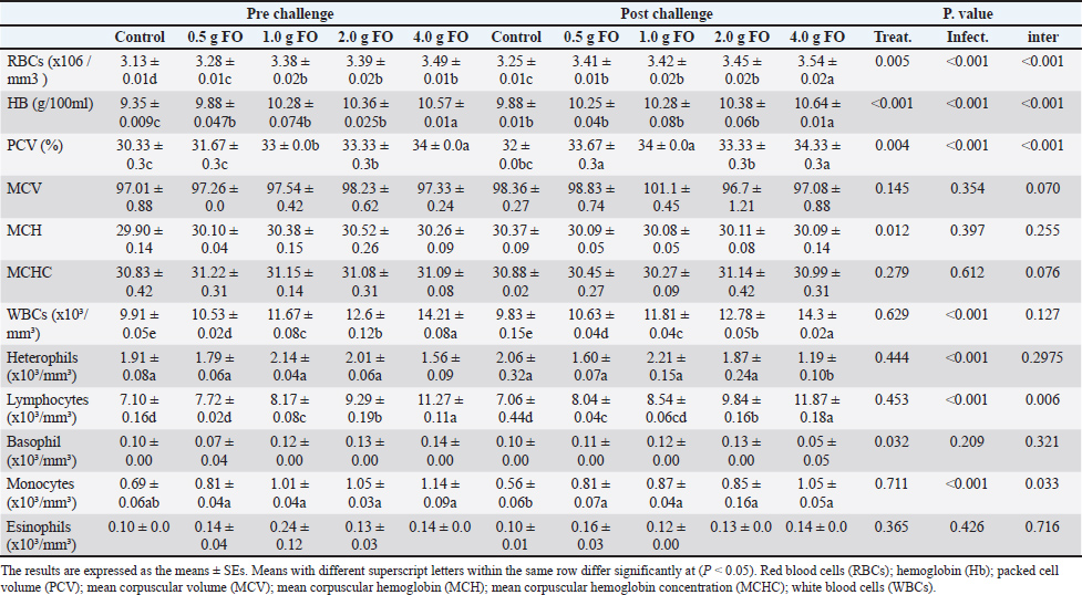 For phagocytic activity (PA) and index (PI), there were obvious increases in their levels with the higher FO-supplementation dose (4.00 g FO/kg diet) in both normal and following A. hydrophila infection compared to the other groups (P < 0.05). Lysozyme also displayed a dose-dependent increase in its activity. Under normal culturing conditions (pre-challenge), the supplementation doses 1–4.00 g of FO/kg diet showed the highest activity (compared with the control and 0.5g FO (P < 0.05). After A. hydrophila exposure, all FO-supplemented groups (0.5–4.00 g FO/kg diet) exhibited higher lysozyme activity than the non-supplemented group (control). Collectively, FO supplementation, particularly at 2 and 4.00 g FO/kg diet, enhanced the antioxidant response by increasing SOD and CAT activities, reduced stress response by reducing MDA levels, and improved innate immunity-related biomarker (PA, PI, and LZ activity). These effects were pronounced with A. hydrophila infection. Hematological parameters and differential leucocytic countDietary supplementation with graded FO levels significantly influenced several hematological parameters under normal culturing (pre-challenge) and following A. hydrophila exposure (post-challenge) (Table 4). FO-dietary supplementation induced clear dose-dependent increases in the red blood cell count (RBCs), hemoglobin (Hb), and PCV (P < 0.05). Under normal culturing, the RBC count, Hb, and PCV peaked at 4.00 g FO/kg, while following A. hydrophila, all FO-supplemented groups showed higher values of these parameters compared with the control (non-supplemented) (P < 0.05). However, no marked alteration was observed in MCV, MCH, or MCHC values across different groups (P > 0.05). Table 4. Hematology and differential leukocytic counts of Nile tilapia fingerlings following FO dietary enrichment.