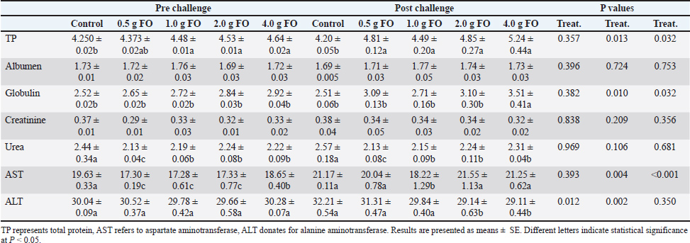 For leukocytic parameters, the total white blood cell (WBC) count markedly increased with increasing FO supplementation levels both pre- and post-A. hydrophila challenge. The highest WBC count was reported in Nile tilapia fingerlings fed with FO supplementation at 4.00 g/kg diet. The count of lymphocytes and monocytes, particularly post-A. hydrophila infection, increased as the dietary FO supplementation level increased, with the highest values at 4.00 g FO/kg diet. However, the counts of heterophils, basophils, and eosinophils did not display a specific pattern either under normal culturing or following A. hydrophila exposure (P > 0.05). In general, dietary FO supplementation up to 4.00 g/kg diet obviously improved the hematological profile and increased the RBC count, Hb concentration, PCV, and total leukocyte count, mainly the counts of lymphocytes and monocytes. These outcomes underscore the role of FO as an effective feed additive that promotes hematopoietic and immune responses. Blood biochemical profile of Nile tilapia fingerlings following fenugreek oil dietary supplementation under normal and A. hydrophila infection conditionsAs shown in Table 5, under normal culturing conditions, dietary FO feeding significantly induced a dose-dependent increase in the total protein levels, peaking at the highest supplementation dose (4.00 g FO/kg diet) compared to the control (P < 0.05). This effect was more pronounced following A. hydrophila challenge, where the highest supplementation dose (4.00 g of FO/kg diet) showed the highest total protein level (5.24 ± 0.44 g/dL) compared to the other groups. Albumen levels displayed minor numerical changes among different supplementation levels, either under normal culturing conditions or following A. hydrophila infection (P > 0.05). However, globulin concentration showed dose-related increases, particularly following A. hydrophila exposure (P < 0.05). Table 5. Blood biochemical profile and liver and kidney function indicators.