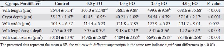Postchallenge infection with A. hydrophilaThe microscopic structure of the intestinal villi of the control group (0.0 g fenugreek oil/kg diet) and those challenged with A. hydrophila revealed severe degenerative effects of the epithelial lining along the entire length of the villi, with exposure of the lamina propria and interstitial edema, in addition to the accumulation of necrotic epithelial cells inside the intestinal lumen. These harmful effects were diminished with dietary enrichment with different fenugreek oil concentrations, especially at higher concentrations (Fig. 5).