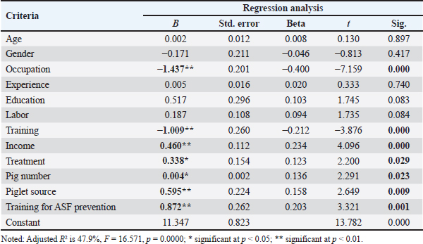 Y=12.168 + (−0.309) × occupation + (−0.509) ×training + 0.333 × piglet source + 0.497× training for ASF prevention. Effect of social profiles on farmers’ knowledge of ASF prevention practicesThe regression analysis results in Table 3 show that some social profile factors significantly influence the ability of farming households to prevent ASF. Main occupation has a negative impact on the ability to prevent the disease (B=−1.437, p < 0.001); farmers who only focus on pig farming may limit the ability to apply ASF prevention measures. Training also has a significant negative impact (B=−1.009, p < 0.001). In contrast, income, treatment method, number of pigs raised, and pig breed origin all had positive and significant effects (B=0.460, p < 0.001; 2B=0.338, p=0.029; B=0.004, p=0.023; and B=0.595, p=0.009), indicating that those who applied appropriate treatments, raised more pigs, or produced their pig breeds had better disease prevention. Participation in ASF prevention training also had a significant positive effect (B=0.872, p=0.001), confirming the importance of training in improving disease prevention. Age, gender, experience, and number of workers did not significantly affect the prevention of ASF. The form of the framework could be as follows: Table 3. Influence on the ability to prevent ASF in farms.