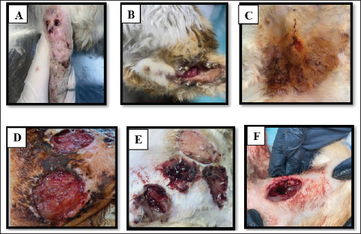 Fig. 1. Feline wound cases: A. Tail wound, B. Anal wound, C. Post-surgical wound, D. Accidental wound, E. Accidental wound , F. Accidental wound. Table 2. Samples of feline wounds categorized according to wound type.