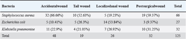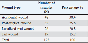 The group size was selected based on a published paper to ensure statistical power while adhering to the ARRIVE and institutional ethical guidelines (Percie du Sert et al., 2020). Creation/induction of S. aureus-infected skin woundsSurgical anesthesia was achieved with the intramuscular administration of ketamine (90 mg/kg BW) and xylazine (40 mg/kg BW). A midline 10-mm full-thickness circular wound was created through the skin. The dorsal skin was clipped, shaved, and treated aseptically. A clinical sample of S. aureus was obtained by the VITEK-2 method and was confirmed as antibiotic-resistant. It was cultured in Mueller–Hinton broth (NDB, China) and was subsequently centrifuged (1,000 rpm, 15 minutes). The resultant pellet was resuspended in 10% phosphate-buffered saline to yield a concentration of 1.5 × 108 CFU/ml. 10 µl volumes were imparted to each wound surface. Treatments were initiated as soon as the wounds showed clinical signs of inflammation and infection, as is the usual practice with therapeutic initiation in infected wounds. Measurement of the wound diameterThe wounds were photographed and measured with a ruler at the exact moment of being created (day 1), 3 days post-infection, and subsequently at the 5 and 10 days post-treatment. All images were analyzed and calibrated on the same day to ensure that the images were in sync over the span of the analyzed frame. The percentage of wound contraction was determined as follows: contraction=(A0−At)/A0 × 100. Where A0 is the initial wound distance, and at is the distance at the respective time (day 3 post-infection and days 5 and 10 post-treatment). The tissue concentrations of VEGF, TNF-α, and hydroxyproline (Hyp) were estimated using rat-specific ELISA kits purchased from Simit, China, according to the manufacturer’s protocols. Because the sample time points were the same as the macroscopic wound evaluations, the biochemical shifts and wound healing were correlated by shape. The measured analytes were used as surrogate markers for VEGF (angiogenic activity), TNF-α (inflammatory activity), and Hyp (collagen deposition and remodeling) to provide a mechanistic perspective on the effects of the treatment on infected wound healing. Histopathological examination (H&E) of the skinUnder anesthesia, skin biopsies (1 × 1 cm squares centered around the wound) were collected at three time points: before wound induction, 3 days after infection, and 10 days after treatment. Specimens were fixed in formalin and sent for further analysis to the Histopathology Unit of the Department of Pathology and Poultry Diseases, College of Veterinary Medicine, University of Baghdad. Using a light microscope, the samples were stained with hematoxylin and eosin to observe the state of granulation tissue, the presence of new blood vessels, inflammation, and collagen, and the overall structural organization of healing to form the tissue. Statistical analysisThe Statistical Package for the Social Sciences (2019) was used to analyze the data. The treatment group and time effects were evaluated, and the mean was calculated using the two-way least significant difference method to check for statistical significance within and between groups. This method determines the main and interaction effects of the healing kinetics parameters in the infected wound model, which were expressed as mean ± SE and statistically significant according to the Least significant difference criteria specified in the results tables. Ethical approvalEthics statement All animal studies were conducted in accordance with universal ethical standards, taking into consideration animal welfare, so that they presented no more than slight discomfort, including, but not limited to, housing, anesthesia and analgesia, wounds, infection, treatment, sampling, and other procedures covering humane endpoints (Approval No. 13/P.G., dated January 5, 2025). All study procedures, including biopsy, euthanasia, and collection procedures within specified animal groups and intervals, were bound by protocol to minimize suffering and ensure the integrity of the study. The study procedures were followed to the letter. ResultsSample distributionOf the 125 feline cases studied, 125 cases displayed grossly inflamed wounds. This demographic included both mixed-breed males and females aged 3 months to 4 years. Representative cases showcased the different types of lesions via clinical photos. This aided in the case categorization that was used in the later analyses. In the current study, the most dominant case was accidental wounds, which amounted to approximately 48 cases (38.4%), followed by post-surgical complications, which amounted to 32 cases (25.6%), localized anal wounds, which amounted to 26 cases (20.8%), and tail wounds, which amounted to 19 cases (15.2%). The data confirm that trauma-linked injuries were the primary injuries dominant in this group. These proportions were the basis for the clinical context, which aided in understanding the prevalence of the treatments isolated from the bacteriology of the sample set. Bacterial isolationInclusions of cultures that the primary samples of the S. aureus showed the presence of different colonies, which facilitated the conclusion of their presence even before the automation process. S. aureus appeared to be colonized with a golden yellow color and was said to be producing on Blood Agar the β-hemolytic colonies. Escherichia coli, which was associated with pink and bright during the earlier stages, appeared to be moistened, grayish, and gaited on blood agar and then transformed to bright pink on MacConkey’s test. Klebsiella pneumoniae was the name that the last cluster formed, which appeared as grayish-white colonies that were mucoid in nature, while Blood Agar was pink in color and transformed into magenta on MacConkey. These data formed a very defining set of the most common pathogens. These distinct sets of phenotypic patterns that were found in cultur