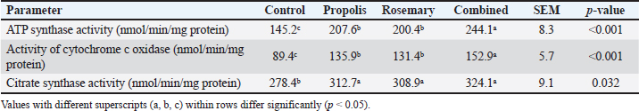 Cellular ATP levels and energy statusHepatic ATP levels increased in all treatment groups by 34%, 38%, and 41% for propolis, rosemary, and the combination treatment, respectively (p < 0.001). Hepatic ATP levels were significantly higher in all groups than in the control group (p < 0.001) (Table 2). Table 2. Effects of propolis and rosemary extract supplementation on hepatic adenosine triphosphate levels and energy status markers in Awassi sheep during late pregnancy.
