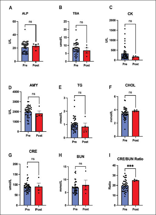 Fig. 6. Erythrocyte and platelet parameters stability after 60 days of remdesivir. No significant alterations were found in (A) red blood cell (RBC) count, (B) hemoglobin (HGB), (C) hematocrit (HCT), (D-F) red cell indices (MCV, MCH, and MCHC), (G) platelet (PLT) count, or (H-I) platelet indices (MPV and PDW). Data represent mean ± SEM. (ns=not significant). DiscussionIn this study, the clinicopathological responses of FIP-affected cats following 60 days of antiviral therapy were evaluated, with a particular focus on the diagnostic and prognostic utility of the A/G ratio. Our cohort included cats, aged 3–24 months. This age range is consistent with established FIP epidemiology, which shows that the disease primarily affects cats aged 2 years (Thayer et al., 2022; Murphy et al., 2024). While some studies have suggested a higher risk of FIP in male felines (Pesteanu-Somogyi et al., 2006; Gaonkar et al., 2019), our study enrolled a relatively balanced group (21 males vs. 25 females). All cats exhibited FIP-related clinical signs, including persistent fever, weight loss, lethargy, and abdominal distension in effusive cases. These consistent demographics and clinical signs confirm that our study cohort is representative of typical, naturally occurring FIP cases seen in veterinary practice (Abbas, et al., 2014; Hamin, 2023). The most striking observation in our study was the dramatic improvement in the A/G ratio within 60 days following remdesivir therapy. Most of the cats enrolled in this study initially presented with A/G ratios close to or below 0.4, an indicator of active FIP due to hypoalbuminemia and hyperglobulinemia (Nururrozi, et al., 2022; Moyadee, et al., 2024). After therapy, however, most cats had an A/G ratio greater than 0.6–0.8, indicating normalization of their serum protein balance. This shift was the result of two changes: first, a remarkable increase in albumin. Albumin is a negative acute-phase reactant, and its rebound suggests decreased systemic inflammation and enhanced hepatic protein synthesis (Barle, et al., 2006). Second, globulins remained stable or slightly decreased. In FIP, high globulin levels are a consequence of chronic antigenic stimulation (Goitsuka et al., 1990; Kipar and Meli, 2014); therefore, its stabilization indicates decreased immune activation after viral replication control. Thus, the rise in the A/G ratio appears to be an undisputed hallmark of both clinical and immunological recovery, further supporting its utility as an inexpensive and informative biomarker of therapeutic response. Although protein parameters improved, hepatic markers such as ALT, AST, and bilirubin did not change. This stability of liver values has two major implications. First, from the standpoint of disease, it suggests that there was neither significant deterioration nor marked recovery in hepatic function over the 60-day period. FIP-related liver enzyme abnormalities are usually mild unless granulomatous lesions are directly present within the liver (Attipa, et al., 2023). Hyperbilirubinemia without high ALT may occur in FIP, possibly due to cytokine-mediated cholestasis independent of direct liver cell damage (Tsai et al., 2011; Torres et al., 2024). The stability of bilirubin in our cohort could indicate that the cats either did not have significant cholestasis at baseline or that it takes longer than 60 days to resolve. Second, the liver panel stability strongly supports the safety of remdesivir and indicates that it is not notably hepatotoxic in cats at this dosage. These results indicate that liver function was mild at the start of treatment and that continuous therapy did not worsen or resolve hepatobiliary activity during the 60-day period. Even in the absence of significant ALT elevations, hyperbilirubinemia is commonly seen in 20%–60% of the effusive form of FIP cases. The lack of significant change in bilirubin or hepatic enzyme alteration supports the view that remdesivir does not exhibit adverse action on liver function, consistent with prior safety evaluations (Force et al., 2023). This finding is particularly significant, given that remdesivir is known to elevate liver enzymes in other species, including humans (Kaka and Wilt, 2022). Our data align with other large field studies in cats, which have found that the hepatic side effects of remdesivir are rare (Rasmussen et al., 2022; Coggins et al., 2023). Furthermore, a number of metabolic and renal markers did not show any significant changes, but the ratio of creatinine-BUN showed a significant change, which represents a significant improvement in the renal protein handling in the cats following remedsivir therapy (Maharani et al., 2025). The most critical immunological finding was the significant rebound of lymphocyte counts (Dascalu, et al., 2024). FIP characteristically results in T-cell depletion and lymphopenia (Knotek et al., 2000; Vermeulen et al., 2013), suggesting a restitution of immune competence. We attribute this to reduced viral replication and the subsequent decrease in systemic inflammation (Mustaffa-Kamal et al., 2019). Our observation is consistent with other reports that equate lymphocyte recovery with clinical remission, positioning adaptive immunity restoration as a vital marker of therapeutic success (Addie, et al., 2022; Tršar, et al., 2019). No significant changes in erythrocyte parameters were observed following the treatment regimen. This lack of fluctuation is consistent with the type of anemia associated with FIP (Olson and Hohenhaus, 2019). Chronic anemia results from cytokine-mediated suppression of erythropoiesis and impaired iron metabolism; resolution typically occurs only after full remission and reduction of systemic inflammation (Chikazawa and Dunning, 2016; Ottenjann et al., 2006). The persistence of mild anemia in some cats likely reflects ongoing recovery or the short monitoring interval, as hematologic normalization may require several months post-therapy (Čern