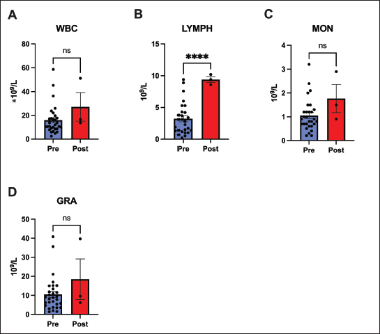 Fig. 5. White blood cell populations. This figure compares white blood cell populations before and after 60 days of remdesivir administration. (A) Total WBC, (C) monocytes, and (D) granulocytes remained stable, and (B) lymphocyte counts increased significantly (p < 0.0001). This lymphocyte recovery indicates a rebound from FIP-induced immunosuppression. Data represent mean ± SEM. (**** p < 0.0001, ns=not significant). Unlike the lymphocyte response, no significant changes were observed in the RBC count or platelet count after treatment. Mean RBC count, Hemoglobin, and Hematocrit remained stable (p > 0.05), with no notable changes in Mean Corpuscular Volume, Mean Corpuscular Hemoglobin, or Mean Corpuscular Hemoglobin Concentration . Some cats had mild anemia before treatment, which generally persisted after 60 days (Fig. 6).