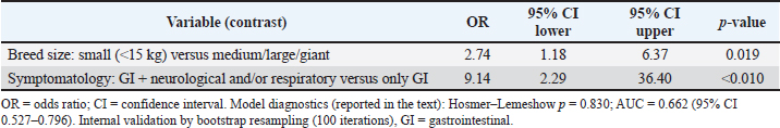 The univariable analysis identified associations between mortality and several variables, including breed size and symptomatology (Table 3). In multivariable logistic regression, small-breed size (<15 kg vs. medium/large/giant: OR 2.74; 95% CI 1.18–6.37) and multisystemic presentation (gastrointestinal plus neurological and/or respiratory signs versus mild: OR 9.14; 95% CI 2.29–36.40) remained independently associated with mortality (Table 4). These estimates indicate a moderate association for small-breed dogs and a strong association for multisystemic disease, albeit with wide confidence intervals reflecting limited precision. Vaccination status was not statistically significant for in-hospital mortality in this hospital-based series of PCR-confirmed CPV infections (unvaccinated vs vaccinated: OR 1.59, 95% CI 0.51–4.85; p=0.429), although the point estimate suggested higher odds of death among unvaccinated dogs (Table 3). Vaccination remains the cornerstone of CPV prevention, and unvaccinated puppies are widely reported to be at increased risk of severe disease. The absence of statistical significance for vaccination status in our analysis should be interpreted cautiously because vaccination histories were incomplete/heterogeneous and the analysis was restricted to infected dogs presenting to the hospital; therefore, these data do not estimate vaccine effectiveness against infection and provide limited power to detect a mortality association among cases. The antigenic variant and comorbidities were also not statistically significant in this dataset (Table 3). The model discrimination was moderate (AUC 0.662; 95% CI 0.527–0.796), indicating that the model supports etiologic interpretation of associations rather than individual-level prognostic accuracy. The calibration was acceptable (Hosmer–Lemeshow p=0.830). The association between small-breed status and mortality is consistent with previous observations in CPV-infected dogs (Ling et al., 2012). Table 3. Univariable logistic regression: mortality by candidate predictors.