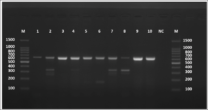 Fig. 1. Agarose gel electrophoresis image (1.5%) shows the amplicons of the ACT2 gene (size=628 bp) in sheep. NC is the negative control in which H2O was added instead of the template DNA. M is a molecular marker (100–1,500 bp) obtained from GeneDirex (South Korea). The negative control lane showed no amplification, confirming that the reactions were contamination-free. All positive samples exhibited distinct bands with no background smearing or nonspecific products, indicating high-quality DNA and primer specificity. The ten sheep-derived ACT-2 amplicons were sequenced following successful PCR. GenBank accession numbers PV959524 to PV959533 were assigned to these samples. Table 2 lists the BLASTn results. Nine of the 10 sequences showed 100% identity with the Chinese reference sequence XM_024498317. Only one sample (PV959528) showed a slightly lower identity at 95.61% (Fig. 2). The alignment results are shown in Figure 3. COX1 geneAll sheep samples amplified successfully at the COX1 locus, yielding a 317-bp band. The electrophoresis results are documented in Figure 4. The absence of amplification in the negative control confirmed that the reaction was not contaminated. Bands from sheep samples were sharp and aligned with the expected size, confirming the effectiveness of the primer. Table 2. The NCBI-BLAST homology sequence identity (%) between local E. granulosus targeting the ACT2 gene in sheep.