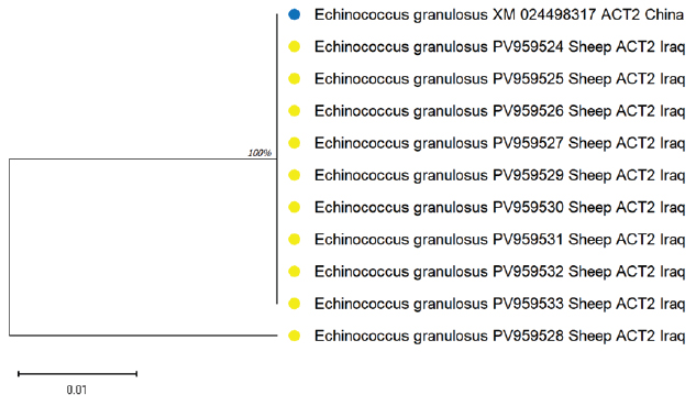 ABSTRACTBackground: Hydatid disease remains a major concern in sheep farming, particularly in endemic areas such as Iraq. Aim: This study aimed to explore the molecular characteristics of Echinococcus granulosus isolated from sheep using multilocus genetic analysis. Methods: Fertile cysts were collected from sheep slaughtered in Diwaniyah and processed for DNA extraction. Four genetic loci—ACT-2, COX1, CYT, and ND1—were amplified by polymerase chain reaction (PCR) and sequenced to evaluate the diversity of the parasite. Results: Each gene yielded fragments of expected lengths, and no contamination was observed in the negative controls. Sequences from sheep isolates were submitted to GenBank, with accession numbers PV959524–PV959533 (ACT-2), PV959270–PV959279 (COX1), PV975191–PV975200 (CYT), and PV975171–PV975180 (ND1). BLAST comparisons revealed identities ranging from 95.6% to 100%, with close matches to isolates from China, Brazil, Estonia, and Turkey. Phylogenetic trees showed clear clustering of local sheep strains with global references, particularly within the G1 lineage. Multiple sequence alignments confirmed a high degree of similarity with minor genetic variation. Conclusion: These results demonstrate the genetic stability of E. granulosus in sheep in southern Iraq and support its inclusion in regional parasite mapping efforts. The data also emphasize the importance of sheep as intermediate hosts contributing to the persistence and spread of this zoonotic parasite. The genetic analysis of E. granulosus from sheep showed close relationships with international strains, reflecting regional transmission and limited sequence divergence. Molecular typing remains essential for the epidemiological control and future vaccine development. Keywords: Alignment, Diagnostic, Liver, Sequencing, Zoonosis. IntroductionCystic echinococcosis (CE) is a disease caused by the larval form of E. granulosus sensu lato (s.l.) (Woolsey and Miller, 2021). This parasite belongs to the tapeworm group. It spreads widely around the world. CE affects both animals and humans. The disease is particularly common in areas where sheep are raised. Sheep often act as intermediate hosts. They get infected when they eat parasite eggs. These eggs hatch and form cysts, mainly in the liver or lungs of sheep. Dogs are the final hosts. They eat infected sheep organs and then pass the eggs in their feces (Manterola et al., 2022). This keeps the infection cycle going. The disease causes significant problems for farmers. Infected animals must be destroyed. This leads to losses in meat production. Farmers also face extra costs for control measures (García-Méndez et al., 2022). In many rural places, such as the Middle East, CE is still common. However, it is often not reported well. Studies using molecular tools have shown that E. granulosus s.l. has different genotypes. The most common species found in sheep is E. granulosus sensu stricto (G1–G3) (Ohiolei et al., 2022). Other types, such as G6 and G7, have also been found in sheep, but they are rare (Hua et al., 2022). Knowing the genotype is essential. It helps in understanding how a disease spreads in a region. Different types may behave differently. Some may cause more harm, affect different animals, or react differently to treatment (Wen et al., 2019; Khademvatan et al., 2019). Research from Europe, Asia, and Africa has shown that sheep strains are genetically similar to those found in other farm animals (Ali et al., 2020; Shams et al., 2022; Casulli et al., 2022a,b). This shows that the parasite easily moves between animals. Nevertheless, differences in parasite types have been found even in the same animal species from different places (Tamarozzi et al., 2020a,b; Borhani et al., 2024). Therefore, it is important to study the parasite locally. Iraq is a country in which such studies are still limited. A good way to study the parasite is through MLG. This method examines more than one gene. It helps to identify differences even within the same genotype. Scientists often use mitochondrial genes such as COX1 and ND1. They also use nuclear genes such as ACT-2 (Aregawi et al., 2024; Gharbi and Giraudoux, 2024). These genes help researchers understand how parasite strains are related. This is useful, especially in areas where the parasite infects many types of animals (Tamarozzi et al., 2020a,b). In Iraq, especially in the south, there are insufficient genetic data about E. granulosus in sheep. This makes it difficult to determine how the parasite is changing or spreading. Conducting more genetic studies on sheep can help. This will improve our understanding of the disease and how it moves between animals (Anvari et al., 2021a,b; Karshima et al., 2022). Sheep are essential in maintaining the parasite cycle. If we do not know which strains are present in sheep, we cannot effectively control the disease (Samei and Khedri, 2025). Good data are needed to make vaccines or deworming programs. Because sheep often live with other animals, they may pass the parasite to others. Studying their role carefully is important. Molecular tools can help us understand how parasites spread between animals and regions (Hua et al., 2022). This study was conducted to provide such information. The genetic types of E. granulosus found in sheep from southern Iraq were examined using PCR and gene sequencing. Materials and MethodsSample collectionFertile hydatid cysts were collected from the liver and lungs of infected sheep during routine postmortem inspection at a slaughter facility. Cysts were microscopically examined to confirm fertility and viability by identifying the presence of protoscoleces and live protoscoleces, respectively (Mokhtaria and Ammar, 2019). Frozen hydatid cysts can replace incineration and sterilize cysts. The germinal layer of each cyst was carefully separated using sterile tools and transferred into labeled Eppendorf tubes. The samples were transported in a cooled c