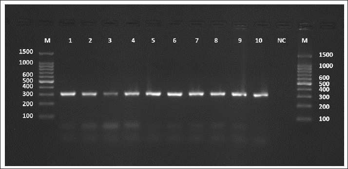 Fig. 7. Agarose gel electrophoresis image (1.5%) shows the amplicons of the CYT gene (size=309 bp) in sheep. NC is the negative control in which H2O was added instead of the template DNA. M is a molecular marker (100–1,500 bp) obtained from GeneDirex (South Korea). Table 4. The NCBI-BLAST homology sequence identity (%) between local E. granulosus targeting the CYT gene in sheep.