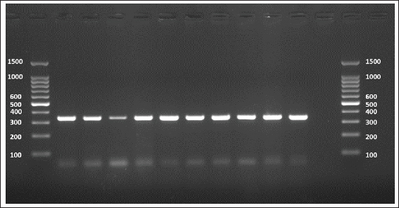 Fig. 10. Agarose gel electrophoresis image (1.5%) shows the amplicons of the COX1 gene (size=344 bp) in sheep. NC is the negative control in which H2O was added instead of the template DNA. M is a molecular marker (100–1,500 bp) obtained from GeneDirex (South Korea). Each sheep sample produced a single, clean band, and no false positives were confirmed by the controls. Table 5. The NCBI-BLAST homology sequence identity (%) between local E. granulosus targeting the ND1 gene in sheep.