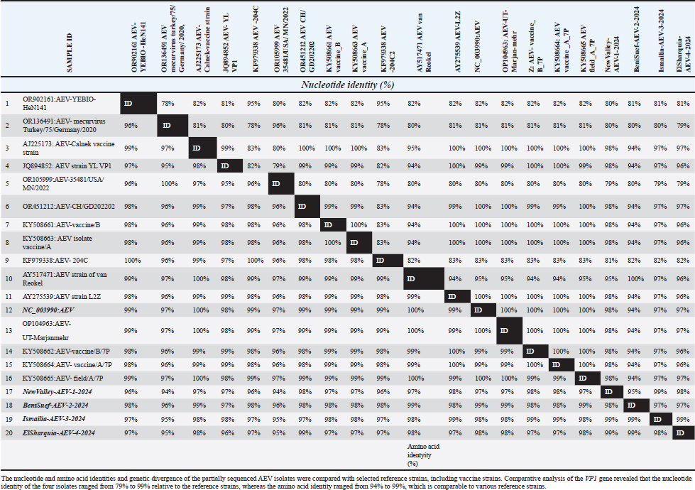 Fig. 5. Alignment of the VP1 amino acid sequences from the four Egyptian AEV isolates and the reference strains. The top row shows the amino acid positions in the YEBIO-HeN141 VP1 sequence. Letters denote amino acid substitutions, dots (.) represent identical amino acids, and dashes (−) indicate alignment gaps. DiscussionIn Egypt, there are many viral infections, causing multiple outbreaks with considerable impact on animal and poultry health (Abd El Hafez et al., 2021; Badr et al., 2022; Ramzy et al., 2024). These viral outbreaks have predominantly resulted from RNA viruses, causing remarkably devastating economic losses in the poultry sector (Amal et al., 2019; Abodalal et al., 2021; Ahmed et al., 2025). Since its first recorded outbreak in the USA in 1932, AEV has been a major concern and a globally prevalent disease causing substantial economic losses to the poultry sector in Africa, Asia, Australia, Europe, and the Americas (Xue et al., 2016; Zhang et al., 2023; Wang et al., 2023; Zhang et al., 2024). AEV has persisted on poultry farms for extended periods despite routine vaccination across different districts of Egypt, which is accomplished by vaccinating poultry flocks against AEV during the growing period. At present, AEV prevention is predominantly based on vaccine strategies. Thus, strengthening the farm’s daily feeding practices and biosecurity protocols, enhancing the breeding environment, and preventing secondary infection are essential (Lin et al., 2018; Sarma et al., 2019). This study aimed to isolate and genetically characterize all available AEV isolate sequences and other commercially available vaccines in four Egyptian governorates to guide AEV prevention and control. To the best of our knowledge, no report has been performed mainly on AEV in broilers in Egypt. The present study was conducted in broiler flocks due to the increasing occurrence of neurological manifestations and economic losses reported in young broilers in Egypt. Broilers represent a highly sensitive indicator of circulating field strains because they are typically not routinely vaccinated against AEV and therefore reflect exposure to natural viruses. Consequently, broilers were selected to better characterize the currently naturally circulating field AEV strains and to evaluate their genetic relationship with vaccine strains used in breeder flocks. As depicted in our findings, the AEV-positive flocks with a prevalence rate of 5.3% showed clinical mild neurological symptoms in young infected chicks, whereas in adult birds, they only showed transient decreases in egg productivity and hatchability, with a mortality rate ranging from 4% to 8% with non-specific necropsy in the investigated birds. These current findings came in accordance with previously reported clinical manifestations (Taunde et al., 2017; Gethoffer et al., 2021; Zhang et al., 2024; Al-Hammadi and Al-Rasheed 2024; Temeeyasen et al., 2024; Xu et al., 2025). Generally, AEV-gross lesions were mild, which is in agreement with previous evidence that the disease had a preponderant clinical presentation of functional impairment of the central nervous system over enormous macroscopic pathology (Temeeyasen et al., 2024; Xu et al., 2025). The most notable gross changes were impacted crops or gizzards, which are responsible for feeding difficulties due to tremors or bird paralysis. Additionally, these changes are considered to be secondary manifestations of neurogenic dysfunction and have been reported in AEV infections (Xu et al., 2025). The apparent lack of visible lesions within the brain despite extreme neurologic presentations reflects the requirement for microscopic examination in the diagnosis of AEV. This dilemma of AEV diagnosis was mainly histopathology and accurate molecular confirmation (Torre et al., 2018; Ghalyanchilangeroudi et al., 2024). Regarding the pathological dissection of the dead birds, changes in lymphocytic encephalomyelitis, particularly in the cerebrum, including perivascular lymphocytic cuffing, neuronal degeneration, neuronophagia, and gliosis, were observed. These lesions were the same as the current pathological situation previously described in the AEV experimental and natural infection (Hauck et al., 2017; Zhang et al., 2024). One of the characteristic lesions identified in this study was central chromatolysis in motor neurons of the cerebrum, a normal change indicating axonal damage or viral-mediated metabolic stress. The observations in this study also align with the findings of previous studies (Temeeyasen et al., 2024; Ghalyanchilangeroudi et al., 2024). This feature was observed in AEV as a response to viral replication in neurons and other neurotropic viral infections (Diab et al., 2019; Mohamed et al., 2025). Although the CNS remains the predominant target, slight to moderate lesions, including submucosal lymphocytic infiltration and glandular epithelial degeneration, were observed in the proventriculus and gizzard. They can point to viral effects on the enteric nervous system or ganglia, as AEV grows in the peripheral ganglia and autonomic plexuses (Shafren and Tannock, 1991). Concerning SPF-ECE inoculation, AEV-inoculated embryos exhibited typical pathological changes in the form of leg stiffness and encephalomalacia. These subsequent results were in line with those of previous studies (Shafren and Tannock, 1991; Taunde et al., 2017; Goto et al., 2019). More importantly, the RT-PCR results with AEV-specific primers revealed 8 positive samples. These current molecular results are closely similar to those of previous studies (Liu et al., 2014; Goto et al., 2019; Zhang et al., 2024; Ramzy et al., 2024). Subsequently, no co-infection with NDV, IBV, ILT, and IBDV was identified. These subsequent findings are not consistent with the reports of Zhang et al. (2024), who reported the prevalence rates of Mycoplasma synoviae and Gyrovirus galga1 as 5.71% and 2.86%, respectively. Particularly, to investigate the evo