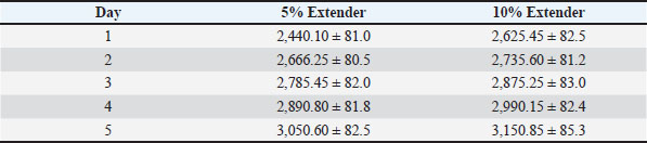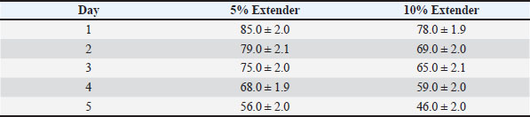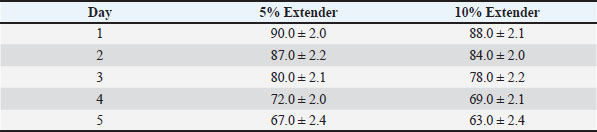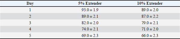 The sperm quality parameters during refrigerated storage are shown in Tables 68. Progressive motility, sperm vitality, and IPM integrity declined gradually throughout the 5-day storage period in both extender groups (p < 0.05).