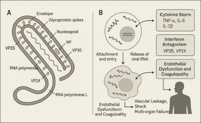 Fig. 2. Ebola virus structure (A) and pathogenesis (B). Clinical manifestationsThe clinical manifestations of EVD reflect a progressive disease, affecting multiple systems, and are strongly influenced by the interaction between viral virulence, the infectious dose, and the host’s immune response (Chiappelli et al., 2015). The incubation period lasts between 2 and 21 days (average 7–10 days), during which the infected individual is not infectious (Do and Lee, 2016). Initial symptoms are usually acute and nonspecific, often mimicking other tropical diseases, such as malaria, typhoid fever, or dengue fever in the early stages (Hasan et al., 2019). In the early stages of infection (days 1–3 of symptoms), patients typically experience a sudden onset of high fever, chills, severe fatigue, muscle aches (myalgia), severe headache, and back pain (Hussein, 2023). Gastrointestinal symptoms, such as nausea, vomiting, diarrhea, and abdominal pain, typically appear on days 3–5, which can lead to significant dehydration and electrolyte imbalance (Martínez et al., 2015). These manifestations reflect systemic spread of the virus through the bloodstream (viremia) and visceral organ involvement (Richards et al., 2025). Entering the advanced stage (days 5–10), clinical symptoms become more characteristic due to endothelial damage and impaired hemostasis (Choi and Croyle, 2013). The virus infects vascular endothelial cells, hepatocytes, and macrophages, leading to vascular leakage, hypovolemia, and impaired blood clotting (Rivera and Messaoudi, 2016). Consequently, some patients exhibit signs of bleeding, such as petechiae, ecchymoses, conjunctival hemorrhage, epistaxis, hematemesis, melena, or bleeding from the injection site (Perry et al., 2012). Although only about 30%–50% of patients experience overt bleeding, this symptom is often an indicator of a poor prognosis (Ji et al., 2016). Liver and kidney dysfunction begin to manifest at this stage, characterized by elevated liver enzyme levels (AST and ALT) and serum creatinine (Warren et al., 2020). In severe cases, encephalopathy can occur due to cerebral hypoperfusion and metabolic disturbances (Rojek et al., 2017). The combination of hypovolemia, coagulation disorders, and multiple organ damage can lead to circulatory shock, leading to multiorgan failure and death, typically occurring between the 7th and 12th day after symptom onset (Rivera and Messaoudi, 2016). Patients who survive typically begin to show clinical improvement between days 10 and 14 (Kadanali and Karagoz, 2015). Signs of recovery include a decrease in fever, normalization of organ function, and return of appetite (Jacob et al., 2020). However, the reconvalescent phase is often accompanied by post-infection complications, such as arthralgia, chronic myalgia, uveitis, conjunctivitis, hearing loss, and general weakness, which can persist for several weeks to months (Mandizadza et al., 2024). Furthermore, Ebolavirus can persist in immunoprivileged locations, such as the eyeball, testes, and central nervous system, for several months (Lyon et al., 2017). This allows for sexual transmission from recovered men, as viral RNA can remain detectable in semen for more than 6 months after recovery (Schindell et al., 2018). This phenomenon has significant implications for outbreak control strategies and public health policy (Paterson et al., 2025). The mortality rate for EVD varies between 25% and 90%, depending on the virus species, health system capacity, and the timing of medical care (Izudi and Bajunirwe, 2024). EBOV is known to be the most virulent and has the highest mortality rate, while SUDV and BDBV have lower fatality rates (Kadanali and Karagoz, 2015). Prognostic factors associated with mortality include high viral load, rapid onset of gastrointestinal symptoms, liver failure, and the absence of an antibody response early in the infection (Yeabah et al., 2025). DiagnosisDiagnosis of EVD requires a comprehensive, multi-step approach, including clinical assessment, epidemiological history, and laboratory confirmation using molecular and immunological methods (Broadhurst et al., 2016). This approach is crucial because early symptoms are nonspecific and often resemble other tropical infections, such as malaria, typhoid fever, or dengue hemorrhagic fever (Martínez et al., 2015). The initial diagnosis of EVD is made by recognizing typical clinical symptoms, such as sudden high fever, severe muscle pain, weakness, nausea, vomiting, diarrhea, and signs of bleeding, along with a history of close contact with a confirmed patient or a wild animal that could potentially act as a reservoir for the virus, such as a bat or a nonhuman primate (Hussein, 2023). A history of travel to an endemic area in Sub-Saharan Africa within the past 21 days is also an important factor in the initial clinical evaluation (Jarrett, 2015). However, because early symptoms are nonspecific, a definitive diagnosis must always be confirmed through safe and standardized laboratory testing (Martínez et al., 2015). Routine hematology tests in EVD patients typically show leukopenia, thrombocytopenia, and an elevated hematocrit, reflecting dehydration due to fluid loss (Koenig et al., 2014). Blood biochemistry may reveal elevated liver enzymes (AST and ALT), hypokalemia, hyponatremia, and elevated urea and creatinine levels, indicating liver and kidney involvement (Kjaldgaard et al., 2022). While these test results are not specific to EVD, they are useful in assessing the severity of the disease and monitoring its progression (Dembek et al., 2024). The primary method for confirming EVD is reverse transcription polymerase chain reaction (RT-PCR) (Coarsey et al., 2017). This technique can detect viral RNA in blood, serum, or other body fluids with high sensitivity and specificity, especially in the acute phase of infection (Ward et al., 2020). RT-PCR can detect the virus from the first day of symptoms and is the gold stand