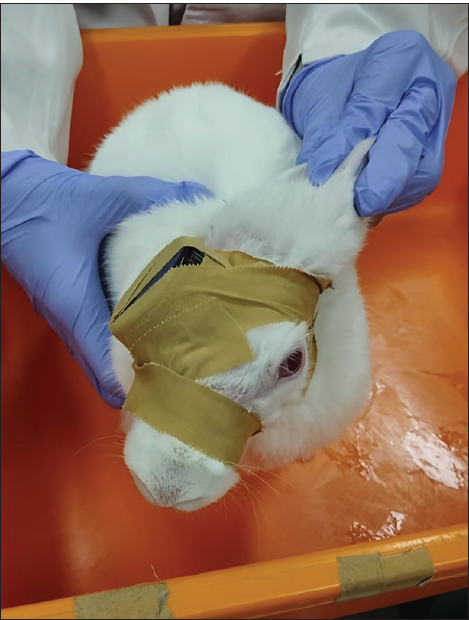 Fig. 2. One of the rabbits during occlusion. The device (black) can be seen in the picture and was eventually completely covered with bandage tape. Tissue collection and D₁R assayRetinal dopamine D₁R expression was selected as the primary outcome measure for validating the occluder design, given its documented role in experimental dopamine research models. After 30 days of occlusion, the rabbits were euthanized before enucleation via intramuscular administration of ketamine (40 mg/kg) and xylazine (5 mg/kg). Both eyes were then enucleated, and retinal and vitreous tissues were carefully dissected and collected for biochemical analysis. Each tissue sample of the rabbit retina and vitreous have 10–20 mg. The tissue was homogenized by added 600 µl/10 mg tissue in 1.5 ml of lysis buffer (PRO-PREP™, iNtRON Biotechnology, Inc., Seongnam, Gyeonggi, Republic of Korea) and a protease inhibitor. After incubation on ice, the homogenates were centrifuged at 13,000 rpm (4°C) for 5 minutes, and the resulting supernatants were collected for ELISA. D₁R levels were quantified using a commercial ELISA kit (RE1689b, Reed Biotech Ltd., Wuhan, Hebei, People’s Republic of China), following the manufacturer’s instructions. Both eyes from each rabbit were analyzed, and the measured retinal D₁R expression was compared with values reported in previous experimental studies to support the validity of the occluder design for dopaminergic changes. Ethical approvalAll procedures were approved by the Animal Care and Use Committee of the Faculty of Veterinary Medicine, Universitas Airlangga, Surabaya, Indonesia (No. 2.KEH.160.10.2023). ResultsThe two rabbits tolerated the bottle-cap occluding device well throughout the 30-day deprivation period. No localized or systemic adverse effects were observed, and no clinical signs of conjunctivitis, corneal opacity, discharge, eyelid edema, or orbital cellulitis were observed in either animal. Biochemical analysis of retinal and vitreal samples showed a consistent reduction of dopamine D₁R concentration in the occluded eyes compared with the unoccluded eyes. In Rabbit 1, D₁R levels were 0.41 ng/ml in the left (unoccluded) eye and 0.26 ng/ml in the right (occluded) eye. In rabbit 2, D₁R concentrations were 2.82 ng/ml in the left eye and 1.95 ng/ml in the right eye. The effect size was small for each rabbit (36,6% in Rabbit 1 and 30,9% in Rabbit 2) because the aim of this study was not to test a hypothesis but as a pilot study to prove the reduction in D1R concentration in rabbit eyes after the eye occlusion process for 30 days, and because D1R has a low affinity for dopamine. However, this study proves that a black bottle cap occluder can reduce D1R in the occluded eye in both rabbits. Thus, in both rabbits, monocular form deprivation with the bottle-cap occluder was associated with a lower retinal and vitreal D₁R concentration in the occluded eye (right eye of rabbits 1 and 2). DiscussionAnimal models of dopamine studies have historically used a wide variety of occluding or diffusing devices, including translucent hoods, contact lenses, and plastic diffusers (McGlinn et al., 2007; Troilo et al., 2019). This diversity of designs contributes to heterogeneity in experimental conditions, which can produce variable outcomes even within the same species and age group. Such variability complicates the comparison across studies and may limit the translational relevance of preclinical findings. In this context, simple, low-cost, and reproducible occluding devices are valuable, particularly if they produce consistent biological signals that align with established mechanisms of dopamine receptors (Huang et al., 2023; Zhou et al., 2017). In the present pilot study, we repurposed black plastic bottle caps into monocular occluders and demonstrated that 30 days of form deprivation was associated with reduced retinal and vitreal D₁R concentration in the occluded eyes compared with those in the unoccluded eyes. This pattern is consistent with the prevailing concept that retinal dopamine and D₁R signaling act as dopamine inhibitors (Huang et al., 2023). D₁R activity is a key link. In the retinal dopamine biosynthesis pathway and the regulation of retinal neuron function and homeostasis within the vitreous environment (Chen et al., 2017; Junior et al., 2024). Under normal visual conditions, patterned light stimulation promotes dopamine release from amacrine cells, activates D₁Rs, and enhances cAMP-mediated pathways that help maintain physiological ocular growth. Dopaminergic activity decreases when form is degraded or visual input is severely reduced, leading to a relative loss of this “stop” signal (Zhou et al., 2017; Veruki et al., 2025). Molecular pharmacology studies of D₁R emphasize that changes in D₁R expression or sensitivity affect the retina’s response to both endogenous and exogenous dopaminergic stimuli. The lower D₁R levels observed in our occluded eyes likely reflect a dysregulated dopaminergic environment, either as a direct consequence of reduced receptor expression or as a downstream effect of chronic reduction in dopamine release and receptor activation (Zhou et al., 2017; Gan et al., 2025; Sahlholm et al., 2025). Although we did not directly administer dopaminergic agents in our study, the observed reduction in D₁R concentration in the form-deprived occluded rabbit’s eye is compatible with these earlier reports, suggesting that our black bottle-cap occluder produces a retinal environment in a rabbit eye model (Zhou et al., 2017; Huang et al., 2023). This study is the first experimental validation of an eye occluder device developed from bottle caps for use in mammalian retinal studies related to dopamine. No previous studies have reported the use or systematic evaluation of similar bottle cap–based occluder devices in rabbits, highlighting the methodological approach’s novelty. Compared with studies using non-mammalian species