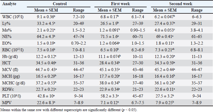 Table 2. Mean, SEM, and range of hematological values before treatment and 7 and 14 days after the start of treatments with psyllium husk powder and aloe vera (PAG) in horses affected by sand accumulation. p values calculated between parameters in control camels before and 7, 14 days after the start of treatment.