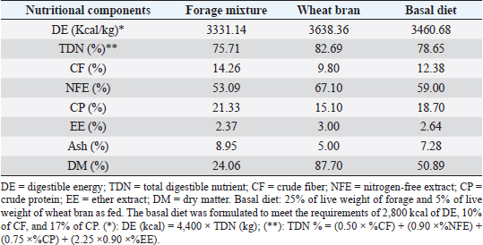AbstractBackground: For more than 50 years, antibiotics have been used to maintain animal welfare and improve efficiency. Recently, antibiotics were found in the muscle, liver, and kidney of guinea pig carcasses put up for sale and human consumption, which is a public health issue. Probiotics are supplements of live microorganisms that, when administered in adequate doses, could replace growth-promoting antibiotics. Aim: This study analyzed the effect of the administration of an oral probiotic mixture on the guinea pigs productive performance (Cavia porcellus). Methods: Fifty male guinea pigs, weaned at 14 days of age, were distributed in a completely randomized design of five treatments with ten repetitions for each group. The treatments were CONTROL group without probiotic; PROB 1 given 1 ml of probiotic; PROB 2 with 2 ml of probiotic; PROB 3 with 3 ml of probiotic; and antibiotic growth promoter (AGP) was given 300 ppm zinc bacitracin. The microorganisms used in the probiotic were Enterococcus hirae, Lactobacillus reuteri, Lactobacillus frumenti, Lactobacillus johnsoni, Streptococcus thoraltensis, and Bacillus pumilus. Productive parameters were evaluated from weaning to 70 days of age. Results: No statistically significant difference was found between the treatments on forage dry matter intake (DMI), concentrateconcentrate DMI, or total concentrate DMI (p > 0.05). Similarly, no statistical difference was found between the treatments in terms of final weight or weight gain (p > 0.05). Regarding the feed conversion ratio (FCR), there was a significant difference between treatments (p=0.045); the CONTROL group had the highest FCR, followed by the AGP group, with the best FCR observed in the PROB 3 group (p < 0.05). In addition, significant statistical differences were found between CONTROL and PROB 2 (p < 0.05). Likewise, a significant linear effect of increasing doses of the probiotic was found (p=0.01), which indicated that the feed conversion was better with a higher dose. Conclusion: The treatments evaluated in this study significantly impacted the FCR in guinea pigs for fattening. Increasing doses of probiotics had a linear effect on FCR. Keywords: Antibiotic growth promoter, Guinea pig, Probiotics, Productive parameters. Introduction The use of antibiotics to maintain animal health, promote growth, and improve efficiency has been practiced for more than 50 years (Abd El-Hack et al., 2020). Recently, Ampuero (2018) found antibiotics in the muscle, liver, and kidney of guinea pig carcasses put up for human consumption in three cities of Peru. Probiotics are living-microorganism supplements that if administered in adequate doses could benefit the host animal by balancing the microbial population in its gastrointestinal tract. These microorganisms compete for adhesion sites with their enteropathogenic peers (Fuller, 1989; Reid et al., 2003; Tiwari et al., 2012), which is complemented by the secretion of bacteriocins by probiotics and peristaltic movements of the intestine (Isolaury et al., 2001; Monteagudo-Mera et al., 2019). Detailed studies on the diversity of natural microbiota in the gastrointestinal tract of guinea pigs are limited; however, it is estimated that 320–376 bacterial genera exist under equilibrium conditions with the host (Hildebrand et al., 2012). The presence of these microbiotas is necessary and beneficial for animals (Turner, 2018; Adedokun and Olojede, 2019), and any imbalance favors the proliferation of harmful bacteria, affecting animal health and performance (Chaucheyras-Durand and Durand, 2010; Young, 2012; Wen and Duffy, 2017; Alayande et al., 2020). Bacteria constituting the intestinal microbiota and those supplied in probiotics, produce bacteriocins, organic acids, and hydrogen peroxide, which have a bactericidal action against enteropathogens (Umu et al., 2016; Garcia-Gutierrez et al., 2019; Alayande et al., 2020). Some bacteria in the normal intestinal flora secrete enzymes such as beta-glucuronidases and bile salt hydrolases, which release bile acids with inhibitory actions on undesirable bacteria (Ferkert, 1993; Ridlon et al., 2016), while others produce digestive enzymes and metabolites capable of neutralizing bacterial toxins, thus increasing the immunity of the intestinal mucosa (Ferkert, 1993; Coppola and Turner, 2004; Garcia-Gutierrez et al., 2019). Alayande et al. (2020) suggested that the main microorganisms used as probiotics in animal production belong to the genera Lactobacillus, Streptococcus, Lactococcus, and Bifidobacterium. It has been stated that the requirements for a microorganism to be considered a probiotic are that it must: (i) be a normal part of the gastrointestinal microbiota of the host; (ii) not be toxic or pathogenic; (iii) be able to adhere to the intestinal epithelium of the host; (iv) be cultivable on an industrial scale; (v) be stable in commercial preparation; (vi) survive the action of digestive enzymes and rapidly colonize the host intestine; and (vii) have antagonistic action on pathogenic microorganisms (Yerlikaya, 2014; Ahasan et al., 2015). Probiotics have been used in chickens (Park et al., 2016), pigs and piglets (Kenny et al., 2011; Dlamini et al., 2017), rabbits (Bhatt et al., 2017), cattle (Uyeno et al., 2015), and horses (Schoster et al., 2014). Several studies claim that probiotics can actively improve the growth and feed conversion ratio (FCR) in pigs and poultry, similar to those obtained with growth-promoter antibiotics (Figueiredo et al., 2010; Mehdi et al., 2018), and also actively participate in the control of pathogenic and non-pathogenic microorganisms (Londoño, 2013). However, their effect depends on the animal species, age, health status, and operating conditions, in addition to the nature of the probiotic compound and dose (Musa et al., 2009; Markowiak and Śliżewska, 2018). Considering that the results of probiotic administration in guinea pigs are still limited and inconsistent (Torres et al