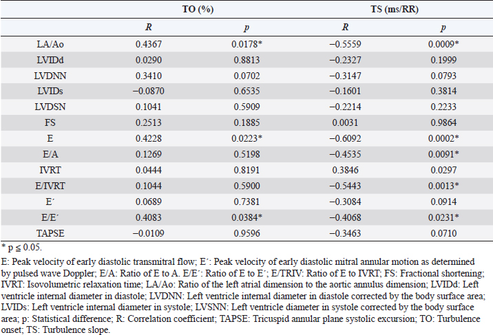AbstractBackground: Myxomatous mitral valve degeneration (MMVD) is the most common heart disease affecting small dogs, it reduces cardiac output resulting in compensatory adaptation of the autonomic nervous system. Chronically, it leads to reduced heart rate variability (HRV) which is an accurate marker for autonomic balance. More than two decades ago in human medicine an indicator of autonomic balance that happens after a premature ventricular beat, it was described as heart rate turbulence (HRT). In humans with ischemic heart disease, the absence of HRT has proven to be a more accurate and an independent indicator of mortality than known HRV parameters. Currently, there are very few studies of HRT in dogs and it is still not tested in small dogs within different stages of myxomatous mitral valve disease. Aim: The aim of this study was to assess the HRT indicators, onset and slope, in small dogs with myxomatous mitral valve disease and to statistically test it. Methods: Dogs under 25 kg had electrocardiogram and echocardiography performed and, in some patients, holter monitoring was carried out. Data were divided into groups B1, B2, C, and D for mean comparison with analysis of variance and Tukey test. In addition, receiver operating characteristic (ROC) curve for differentiating among symptomatic and asymptomatic dogs and for differentiating between remodeled and non-remodeled hearts. The Pearson was executed after correlations of turbulence onset (TO) and turbulence slope (TS) with commonly used echocardiographic parameters. Results: Variance analyses held significant differences in TO and TS between stages B1 from stages C and D, while B2 held similarity to the other groups. In the receiver operating curve was found a very good area under the curve for differentiating among symptomatic and asymptomatic dogs and remodeled and non-remodeled dogs. Few echocardiography parameters held weak correlation with TO while others held weak to moderate correlation with TS. Conclusion: In dogs with MMVD and without other diseases, HRT is a feasible indicator for autonomic balance. Our result suggests HRT changes as the MMVD progresses and congestive heart failure is present. More studies with HRT are needed. The number of ventricular premature contractions (VPCs) may be the strongest limitation for the technique. Keywords: Baroreflex, Autonomic balance, Heart rate variability, Turbulence slope, Turbulence onset. IntroductionIn human medicine, a baroreflex indicator is heart rate turbulence (HRT). This demonstrates the response of the cardiac cycle after a premature ventricular beat interrupts sinus rhythm. This non-invasive method stratifies the risk of death and proved to be a strong and independent indicator in man with results better than heart rate variability (HRV) (Schmidt et al., 1999). The HRT is considered to be a biphasic indicator, starting with the turbulence onset (TO), defined as the initial or the acceleration phase and the turbulence slope (TS), considered the terminal or deceleration phase. Intrapatient variability may occur depending on coupling interval time, and heart rate (Bauer et al., 2008). In people with mitral valve prolapse HRT was statistically different from normal subjects, while HRV showed no difference (Gunduz et al., 2006). When divided by the New York Heart Association scale classes I and II had a significantly higher HRT slope than patients in class III (Davies et al., 2001). In dogs myxomatous mitral valve degeneration (MMVD) also known as endocardiosis accounts for 75% of all cardiovascular diseases in dogs under 25 kg and is the heart disease with the highest morbidity and mortality. Clinical signs are generally seen >7 years of age. The mitral degeneration leads to regurgitation and reduced cardiac pumping ability causing volume overload of the left atrium and ventricle (Borgarelli et al., 2008; Fox, 2012). The objective of the present study was to assess and compared the HRT in dogs with myxomatous mitral valve disease at stages B1, B2, C, and D, to calculate it sensitivity and sensibility through receiver operator characteristic (ROC) analyses and to check for correlations with commonly used echocardiographic parameters. Materials and MethodsThe study was conducted at the Veterinary Hospital of Universidade Federal do Paraná. The data collection was designed to gather only information of male and female dogs under 25 kg presenting a mitral valve regurgitation due to mitral valve myxomatous degeneration in stages B1, B2, C, and D. The retrospective part of the study was done with data of 15 dogs while for the prospective analysis 18 dogs were accepted. The total number of dogs enrolled in groups B1, B2, C and D were 10, 7, 10 and 7 respectively, in a total of 34 subjects, 18 females and 16 males. The most common breeds were cross breed dogs (13% or 31%) and poodles (10% or 24%). A total of 19 holter and 15 electrocardiogram examinations were performed (Table 1). For all patients, electrocardiography, echocardiography, creatinine were available, some patients also had exams of seric cACTH or T4, those with diagnosed hyperadrenocorticism or hypothyroidism were not accepted. Retrospective patients had no holter data available, thus only their electrocardiography record was used for the analyses and only prospective patients had holter carried out. Animals in stages B2, C, and D were medicated according to American college of veterinary internal medicine (ACVIM) guidelines (Keene et al., 2019). If the prospective dogs met all the inclusion criteria the owners were invited to participate in the study by 24 hours holter monitoring of the dog. In the electrocardiography and holter if a sinus rhythm, sinus arrhythmia or sinus tachycardia was the main rhythm and at least one ventricular premature contraction (VPC) was present the patient was accepted for HRT calculation. Only dogs with maximal creatinine seric level of 1.4 mg/dl were considered having normal renal f