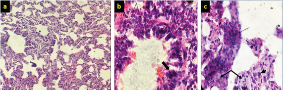 Fig. 4. (a) There is marked branching of the alveolar spaces (arrow) due to hyperplasia of alveolar cells and emphysema (thick arrow) (10×; H&E). (b) Higher magnification marked papillary projection toward the lumen of bronchioles (thick arrow) (40×; H&E). (c) Hypermagnification of marked hyperplasia epithelial cells (thick arrow) of bronchioles within infiltration of macrophages (arrow) in the mucosa of bronchioles (40×; H&E).