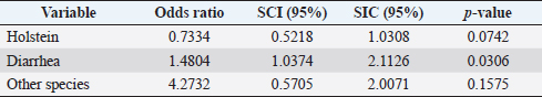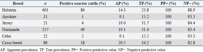 where Z =confidence level; n =sample size; E =accepted error; p=expected value of the proportion; and α=tail probability. Variables evaluatedThe variables were divided into two categories: those related to the animal, considering the age, breed, sex, and reproductive events of the cattle evaluated, and those associated with the farm, prioritizing the management practices implemented on the farms that participated in the study. Sample collection and processingThe samples were obtained from females and males of different ages belonging to the Ayrshire, Holstein, Jersey, Normande, Zebu, and crossbreeds unvaccinated. 7 ml of blood was extracted by coccygeal venipuncture and stored in Vacutainer® tubes for subsequent refrigeration (4°C) and transport to the Veterinary Parasitology laboratory of the Universidad Pedagógica y Tecnológica de Colombia (Uptc). The samples were centrifuged (2,500 rpm/10 minutes) to obtain the serum, which was transferred to an Eppendorf tube for storage at −20°C. The samples were analyzed by microscopic agglutination test (MAT) (OIE, 2021). The selected strains were cultivated in liquid culture medium for leptospires at 30°C ± 2°C for 4–10 days. Live cultures with densities of approximately 2 × 108 leptospires per ml were used as antigens. To standardize culture density, cultures may need to be adjusted to a concentration of 2 × 108 leptospires per ml prior to testing. A selection of antigens was made with a serum dilution of 1/50. A volume of each antigen, equal to the volume of the diluted serum, was added to each well to make a final serum dilution of 1/100 in the screening test. Microtiter plates were incubated at 30°C ± 2°C for 1.5–4 hours. Plates are examined by darkfield microscopy (OIE, 2021). Animals were considered positive when titers were ≥1:100, with a sensitivity of 60% and a specificity of 100%. Statistical analysisThe study was an observational, descriptive, cross-sectional study with simple random sampling. The real prevalence and MAT’s predictive values were found with WinEpi statistical program. With the database consolidated and cleaned, the analyses were performed with the EpiInfo® statistical program. The determining factors were defined by calculating the prevalence ratio (PR). The dependent variable (Y) included the serological results obtained, while the independent variables (X) were all the determining factors established in the structured epidemiological survey implemented during sample collection; the association between the presentation of the disease and the variables evaluated was determined using Fisher’s exact test. Once these factors were established, a final model was constructed using logistic regression analysis. Ethical approvalThe study was conducted under Law 576 of 2,000 and Law 84 of 1,989 of the Republic of Colombia. Informed consent was obtained from the cattle owners before sample collection. ResultsThe apparent prevalence (AP) of bovine leptospirosis was 16% (160/1,000), where 15.4% (134/869) of the females and 19.8% (26/131) of the males were positive for the disease. A true prevalence (TP) of 26.7% was established with a positive predictive value (PP+) of 100% and a negative predictive value (NP−) of 87.3%. Concerning the breeds evaluated, the crossbreeds (20.5% AP; 34.2% TP) and the Normande breed (19.1% AP; 31.4% TP) had the highest prevalence of leptospirosis, while the Cebu cattle had the lowest prevalence (9.1% AP; 15.2% TP) (Table 1). Regarding the age groups evaluated, individuals <1 year old presented the lowest seropositivity (12.3% PA; 20.5% TP), followed by cattle aged 1–2 years (16.7% PA; 27.8% TP), >4 years (16.8% PA; 28% TP), and animals aged 2–4 years (17% PA; 28.3% TP) (Table 2). Likewise, a seroprevalence of 5.1% (51/1,000) was determined for Leptospira interrogans serogroup Pomona; 3.4% for L. interrogans serogroup Sjroe serovar Hardjo (34/1,000); 3.3% for L. borgpetersenii serogroup Tarassovi (33/1,000); 2.5% for Bratislava (25/1000); 2.3% for L. grippotyphosa (23/1,000); 2% for L. interrogans serovar Copenhageni (20/1,000); and 1.6% for L. weilii serogroup Celledoni and L. interrogans serogroup Canicola (16/1,000) (Table 3). No significant statistical association was found between the age and sex of the cattle evaluated with positivity to bovine leptospirosis (p ≥ 0.05). However, an association was established between the Holstein breed and the presence of the disease ( p=0.04501051). Likewise, this variable was identified as a possible risk factor for the presentation of Leptospira spp. (Table 4). A significant statistical association was found between the variables: the presence of barnyard ( p=0.00173898) and other species in the farms evaluated ( p =0.04350552). The barnyard was identified as a protective factor against leptospirosis, while other animal species’ presence was considered a possible risk factor associated with the presentation of the disease (Table 5). Regarding the reproductive variables evaluated, a significant statistical association was found with artificial insemination (AI) ( p=0.02419551), the use of certified semen ( p=0.01156504), and abortion ( p=0.03828675); the first two variables were identified as possible protective factors associated with bovine leptospirosis (Table 6). In relation to clinical manifestations, diarrhea presented a significant statistical association ( p=0.00794417) and a possible risk factor for the presentation of the disease (Table 7). Logistic regression allowed establishing that the only risk factor associated with bovine leptospirosis is the presentation of diarrhea in the cattle evaluated (Table 8). DiscussionThe seroprevalence of bovine leptospirosis for this study was lower than the 54.2% found in the municipality of Toca, Boyacá (Pulido-Medellín et al., 2017). Other studies at the national level reported prevalences of 41% in Montería (Córdoba) (Hurtado et al., 2013), 6.1%–46.5% in Caquetá (Motta 