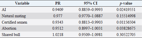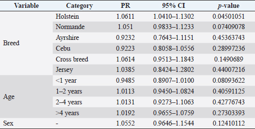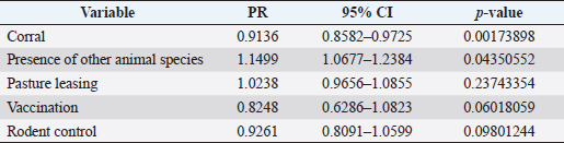 Table 5. Analysis of management practices as possible risk factors associated with Leptospira spp. infections. Results are presented as PR and 95% CI.