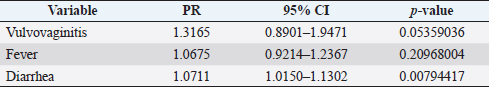 Table 7. Analysis of clinical manifestations as possible risk factors associated with Leptospira spp. infections. Results are presented as PR and 95% CI.