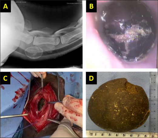 Fig. 1. (A) Lateral radiograph showing radio-opaque foreign body mass at the level of intervertebral disc between sixth and seventh cervical vertebrae. (B) Endoscopic view reveals the foreign body mass lodged in the esophageal lumen with accumulated saliva and redness in the esophageal mucosa. (C) Surgical esophageal incision to expose the large trichobezoar. (D) large, rounded to ovoid trichobezoar (85 mm × 75 mm × 42 mm). Surgical management (esophagotomy)Cervical esophagotomy was performed for the removal of the foreign body mass. The anesthetic regimen comprised sedation with xylazine 2% (0.2 mg/kg IV), followed by general anesthesia using ketamine hydrochloride 10% (2 mg/kg IV). The she-camel was placed on the right lateral recumbency and a stomach tube was introduced to the level of obstruction. The distal third of the neck was prepared for surgery. A 10 cm long incision was made at the ventrolateral aspect at skin and fascia, and then sternocephalicus and sternothyrohyoideus muscles were bluntly separated while preserving the jugular vein that lies under the sternocephalicus muscle (Fig. 1C). The esophagus that is located dorsolateral to the trachea and under the jugular vein was held with two stay stitches (Fig. 1C). A 5 cm longitudinal incision was made in its dorsolateral aspect through the outer fibrous and muscular layer and then through the inner submucosal and mucosal layers, to expose the lumen. Rochester-Carmalt forceps were used to extract the obstructing bezoar (Fig. 1C and D). The stomach tube was then pushed toward the chest to check the patency of the esophagus and the surgical field was flushed using a sterile normal saline solution to remove any food debris. The esophageal mucosa and submucosa were sutured using a simple interrupted pattern (in out – out in) using 1–0 Surgicryl® (Smi AG, HÜnningen 37 Belgium). The outer muscular and fibrous layers were opposed with a simple continuous pattern using the same suture material. Benzylpenicillin 3 g powder was dusted into the depth of the wound. The fascia over the muscles was opposed using 1–0 Surgicryl® (Smi AG, HÜnningen 37 Belgium) in a simple continuous suture pattern. The skin was closed using 2 silk (Lukens Medical, USA) sutures in an interrupted horizontal mattress suture pattern. Post-operative careFood and water were withheld for 48 hours after surgery and maintenance intravenous fluid therapy (Lactate Ringer’s solution) was administered at a rate of 10 ml/kg/hour, over approximately 3 hours. Camel was only fed milk or soft food subsequently. The animal was injected with Penstrept® (IM at a dose of 20 mg/kg) every 72 hours, and anti-inflammatory flunixin meglumine (Flunixin)® at a dose of 1.1 mg/kg for 7 days. The skin sutures were removed 14 days post-operatively. Post-operative follow-up information via telephone contact with the owner revealed general improvement with a lack of any gastrointestinal disorders. The animal was inspected after a 4-week-follow-up period. DiscussionThis study showed that the weight of the bezoar removed from the esophagus was 45 g and its dimensions were 85 mm × 75 mm × 42 mm (Fig. 1D). In our study, the bezoar that was removed from the animal’s esophagus consisted of hair, most likely due to self-licking and licking other animals. Trichobezoars were reported in the rumen and intestines of camel calves (Gameel et al., 2000; Eljalii et al., 2014). However, trichobezoars are extremely rare in camels (Ramadan and Abdi-Bey, 1990; Gameel et al., 2000). In camel calves, usually esophageal obstruction occurs due to the ingestion of foreign materials like plastic bags, ropes, metallic objects, and plastic boltless usually found in the environment of the animal (Ramadan and Abdi-Bey, 1990; Gameel et al., 2000; Ahmed, 2011; Shawaf et al., 2017). Esophageal obstruction due to bezoars is generally caused by reverse migration from the stomach leading to acute esophageal obstruction. It is very rare and to the best of our knowledge, there was no report of esophageal obstruction due to trichobezoar in camels. Also, esophageal obstruction due to phytobezoar (wheat straw) was reported by Singh et al. (2021) in two cases of camels. The mechanism of how this bezoar moved from the rumen upwards to the esophagus in camel is questionable, but similar previous studies reported the probable causes for regurgitation of bezoars from the lower digestive tract into the esophagus when severe retching or nausea occur and become lodged in the esophagus causing an acute esophageal obstruction (Pitiakoudis et al., 2003; Zhang et al., 2020), which could the most likely the reason in this case. Clinical signs, radiography, and endoscopy could identify the type and size of the foreign body and its location (Archer, 2013). Three methods were tried in this case to diagnose the esophageal obstruction. Oro-pharyngeal insertion of the stomach tube into the esophagus gave an indication of the presence of the obstruction (Fowler, 1996). The esophageal obstruction was fully confirmed by the experimental administration of water to the animal using a gastric tube and the impossibility of its passage into the rumen. Plain radiography succeeded in visualizing the radio opacity of obstructive mass (Pitiakoudis et al., 2003; Ramadan, 2016; Zhang et al., 2020). Endoscopic examination revealed the nature of the obstructive mass and the condition of the esophageal lumen and mucosa (Fig. 1B) as previously reported (Ahmed, 2011; Shawaf et al., 2017; Zhang et al., 2020). In this case, we had difficulty withdrawing the trichobezoar with endoscopic vision using special forceps as described previously (Shawaf et al., 2017), because the foreign body was large and its oval smooth shape made it difficult to grasp the bezoar. ConclusionThis case represented the first report of esophageal obstruction by a trichobezoar in a camel. Radiography and endoscopy are valuable diagnostic methods to determine the position and nature