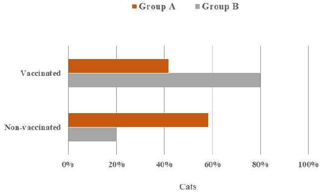 Fig. 4. Clustered bar chart showing the percentages of vaccinated and non-vaccinated cats in Group A and Group B.
