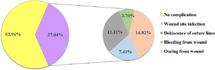 The absence and presence of postoperative complications, irrespective of groups of overall spayed queens (n=27), are embellished in Figure 6. In 62.96% cases, there were no observed complications postoperatively. On the other hand, some cats (37.04%) were found to have few complications, i.e., wound site infection (7.41%), dehiscence of suture lines (11.11%), and bleeding (3.70%) and oozing (14.82%) from wounds after spaying.