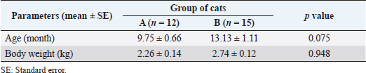 The age (month) and BW (kg) of the female cats in both Group A and Group B are presented in Table 1. There were no significant (p < 0.05) differences in the mean values of age and body weight of the cats between the two groups. Although the queens in Group B having kittens were older and heavier than their contemporaries of Group A that did not given birth to any kittens before.