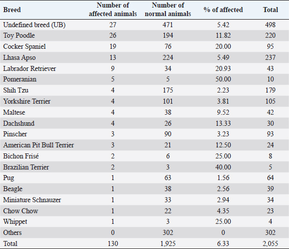 Table 2. Distribution of breeds diagnosed with PRAs relative to the total number of affected animals and their respective of odds ratio (2014–2018).