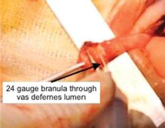 Fig. 3. Permeability check using a 24-gauge branula through the vas lumen.