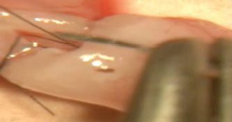 Fig. 6. Microsurgical view (magnification 25×), needle passed through the vas lumen taking all the layers of the vas together in a one-layer suture.
