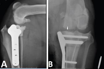Fig. 2. Mediolateral (A) and craniocaudal (B) radiographs illustrate lateral tibial intra-articular jig pin hole placement. The black arrows show the pin tract distal to the medial subchondral bone, and the white arrow shows an osteochondral fragment created during intra-articular pin placement. Of the cases that had intra-articular jig pin placement, TPLO was performed by board-certified surgeons in 15 (40.5%) stifles, by second-year residents in 10 (27%) stifles, and by third-year residents in 12 (32.5%) stifles. There was no association between intra-articular jig pin placement and experience level of the primary surgeon (p=0.4). DiscussionThis retrospective study reports a 5.3% incidence of intra-articular placement of the proximal jig pin in dogs that underwent TPLO. While the placement of the jig pin is temporary, the trauma caused by intra-articular pin placement may have consequences. Suboptimal clinical outcomes following TPLO may be contributed by articular cartilage damage and/or potential meniscal injury. In addition, intra-articular pins may cause intra-articular fractures. Unfortunately, we were not able to investigate the effects of intra-articular jig pin positioning on overall outcomes with our study design; thus, whether the patterns of injury we identified have clinically relevant consequences remains unknown. Postoperative meniscal damage is reported to occur after TPLO, (Fitzpatrick and Solano, 2010; Pacchiana et al., 2003; Thieman et al., 2008) but the cause seems to be unclear (Thieman et al., 2008). It has been recommended to use the insertion of a 25-gauge needle immediately caudal to the medial collateral ligament in the proximal-most aspect of the tibia as a guide for the proximal jig pin placement (Devine et al., 2003; Kowaleski et al., 2012). A prospective study in 40 canine cadaveric stifles reported grossly visible iatrogenic medial meniscal damage from a medially placed hypodermic needle in dogs undergoing TPLO (O’Brien and Martinez, 2009). In that study, tibial articular cartilage and medial meniscal damage occurred in up to 80% of stifles; the needles (20 G or 25 G) were placed only once in the joint during the procedures. They reported a potential needle placement safe zone, which had a lower incidence of damage; however, any needle placed in this location still created damage to the joint. The zone was described to be cranial to the medial collateral ligament (O’Brien and Martinez, 2009). Based on the size of a jig pin (3 mm diameter) recommended for TPLO, it is obvious that intra-articular pin placement could cause much more damage when compared to a 20 G needle (0.9 mm diameter). A study describing potential complications related to TPLO found that 1% of dogs had inadvertent intra-articular placement of jig pins (Priddy et al., 2003), which is lower than what was identified in our study. The discrepancy between the two studies may be due to the inclusion criteria (such as performing TPLO without a jig), incomplete details about radiographic findings in the medical records, and/or differences in methodology for evaluating radiographs between studies. The presence of intra-articular jig placement was not evaluated clinically in these previous studies or in our study and, therefore, it remains uncertain whether or not intra-articular jig pin placement will have an impact clinically. There is certainly evidence to suggest a compromise to the stifle in this manner can be clinically relevant. Progressive cartilage damage consistent with osteoarthritis was reported in a rabbit that had two holes drilled into a non-weight bearing region of their femur (Huebner et al., 2013). The rabbits were euthanized in subgroups at different times (up to 52 weeks), and stifles were evaluated grossly and histopathologically. Intra-articular cartilage damage with osteoarthritis was attributed to the presence of bone tunnels (Huebner et al., 2013). Therefore, it is likely that inadvertent intra-articular jig pin placement leads to progressive cartilage degeneration. Meniscal and cartilage damage due to temporary intra-articular pin placement may be potential causes for postoperative lameness after TPLO, and further investigation is needed to determine the clinical impact of these complications. During our analysis, we found that the lateral tibial plateau may have been at higher risk for intra-articular damage based on the trajectory of the jig pin. Although anatomic variants of the tibial plateau exist between breeds (Ocal et al., 2013), in general, the lateral tibial condyle surface has a steeper slope than the medial tibial condyle (Sabanci and Ocal, 2014). The difference between plateau anatomy may lead to intra-articular jig pin placement in the lateral compartment, even if the pin is not entering the medial joint space, which happened when the jig pins were inserted too proximally. Another factor that led to intra-articular pin insertion in the lateral plateau was the angulation of the jig pin proximally. In both cases, the pins were inserted in the lateral plateau due to long drive distance within the tibia. The medial group intra-articular jig placement, however, occurred due to the insertion of the pin less than 2 mm from the medial plateau with or without proximal angulation of the pin. Based on our study, a few recommendations should be followed when inserting the proximal jig pin to avoid intra-articular jig pin placement. The medial to lateral width of the tibial plateau should be measured, and the proximal jig pin inserted up to half of this measurement. In addition, the jig pin should be placed 3–4 mm distal to the articular surface, immediately caudal to the medial collateral ligament. Finally, the angle of the jig pin relative to the mechanical axis of the tibia should be assessed, and it should be perpendicular to the pin. We also evaluated whether a high TPA would increase the risk of intra-articular jig pin placement based on the fact that the cauda