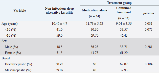 AbstractBackground: Canine non-infectious deep ulcerative keratitis is considered a severe ocular disorder that possibly can progress to perforation. Immediate treatment should be directed to stimulate corneal wound healing, control infection, and minimize self-trauma while eliminating the underlying causes. Aim: This retrospective study was aimed to compare the difference in non-infectious deep corneal wound healing time between cases treated with medical therapy alone and those treated with medical therapy combined with a nictitating membrane flap. Methods: The medical records at the Ophthalmology Clinic, Small Animal Teaching Hospital, Faculty of Veterinary Science, Chulalongkorn University between January 2018 and March 2020 were retrospectively reviewed. Sixty-six eyes (from 65 dogs) diagnosed with non-infectious deep ulcerative keratitis from the medical treatment group (n=34) and the combined treatment group (n=32) were included. The combined treatment group was prescribed the same conservative medical administrations plus a surgical nictitating membrane flap for 14 days. Results: Healing time was defined as the duration of time from the day that the dog had been diagnosed with deep ulcerative keratitis by a fluorescein staining test to the day that the corneal fluorescein stain was negative. Overall, the mean age of dogs with deep ulcerative keratitis was 10.49 ± 4.7 years. The disease was commonly evident in females more than males. Shih Tzu was the most prevalent dog breed. The corneal healing time between dogs receiving medical therapy alone and those receiving combined treatment was not statistically significant (p=0.386). Healing times were not significantly different between sex and breed (p=0.41). The median corneal healing time for dogs older than 10 years in the combined treatments group (29.5 days; ranging from 20 to 46 days) was longer than for those receiving medical therapy alone (21 days; ranging from 9.5 to 30.5 days). Conclusion: Supportive therapy including a nictitating membrane flap is suggested in dogs prone to deep corneal ulcers not involving infection. Even though the healing time is not statistically significant, a nictitating membrane flap acts as a tissue bandage to reduce friction over the cornea, and it also alleviates the healing process by moistening the ocular surface. Keywords: Corneal healing, Deep corneal ulcer, Dog, Nictitating membrane flap, Non-infectious ulcerative keratitis. IntroductionUlcerative keratitis is one of the most common ocular diseases in veterinary ophthalmology. It has been reported in many countries: 60 out of 4,500 cases from the Veterinary Clinical Complex in India (Kumar et al., 2018) and 834 out of 104,233 cases from Primary Veterinary Care in England (O’Neill et al., 2017). Statistical relationships between the incidence of ulcerative keratitis in dogs and other factors (breed, age, and sex) were reported (O’Neill et al., 2017; Kumar et al., 2018). There are several aetiologies of canine ulcerative keratitis (Martin, 2005; Gilger et al., 2007), of which the most common cause is exogenous trauma (Crispin, 2002). Transparency of the cornea is critical for proper vision. Its significant refractive function allows the transmission of light to be focused onto the retina. The cornea acts as a good physical barrier protecting intraocular structures from external insults; infectious and non-infectious. It is therefore important to address any primary causes of ulcerative keratitis promptly prior to the progression to aggressive corneal damage. Not only deep ulcerative keratitis has a higher risk of infection, but also a greater loss of transparency leading to severe ocular pain, a greater risk of intraocular damage, visual impairment, and blindness (Ledbetter et al., 2013). Numerous treatments have been described to treat deep ulcerative keratitis. Medical treatment should promptly be initiated as the first line of treatment. The route of administration depends on the depth, size, and location of the lesion. Extensive topical antibiotics should be given for the prevention of secondary bacterial infection, which could lead to complicated corneal ulcers (Pirdankar et al., 2020). Cycloplegics and mydriatics should be prescribed to reduce ciliary spasms and produce mydriasis. They help to relieve ocular pain and prevent the formation of synechia. Additional administration of a topical anti-collagenase agent is very useful to stimulate corneal cell proliferation (Maggs et al., 2013). Systemic administration of anti-inflammatory agents is recommended for deep corneal lesions to prevent rapid loss of vision from anterior uveitis. Superficial ulcerative keratitis wounds treated with medication alone had a recovery time of 2 weeks shorter than the recovery time for deep corneal wounds. Moreover, some deep ulcerative keratitis cases did not heal completely with medical treatment alone (Kim et al., 2009). Irritation (Maggs et al., 2013) and infection (Wang et al., 1998) were major complications during the healing period of canine deep ulcerative keratitis. Therefore, surgical intervention is recommended for deep, severe, or progressive ulcerative keratitis, in addition to medical treatment. For deep ulcerative keratitis with the loss of more than 50% of the corneal thickness, biological graft, and biomaterials were recommended (Balland et al., 2016; Jaksz et al., 2021; Santillo et al., 2021). Moreover, supportive therapy to the ocular surface, such as a nictitating membrane flap and a bandage contact lens, is widely used to protect the cornea from irritation due to blinking or exogenous stimuli (Slatter, 2001; Gilger et al., 2007). A nictitating membrane flap is one of the supportive therapies used to avoid movement of the third eyelid (Maggs et al., 2013) and support the weakened cornea (Giuliano, 2015) by covering and moisturizing it with the precorneal tear film. The procedure can easily be achieved with standard ophthalmic surgica