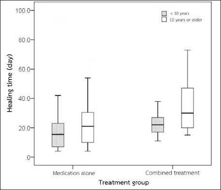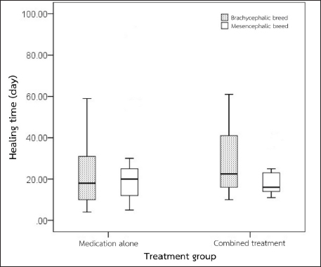Fig. 3. Comparison of the healing time between treatment groups and ages. The brachycephalic breed is a major risk factor for canine ulcerative keratitis and keratomalacia (Tsvetanova et al., 2021). In this study, the majority of dogs are brachycephalic. Shih Tzu is the most common breed and it is known for a predisposition to keratoconjunctivitis sicca that possibly leads to ulcerative keratitis (Kim et al., 2009; Costa et al., 2021). When proteinase activity is uncontrolled during corneal wound healing, keratomalacia usually occurs and is in association with deep ulcerative keratitis. The healing rate of melting keratitis was only 50% when receiving intensive medical treatment (Guyonnet et al., 2020). Additional supportive therapy such as a nictitating membrane flap may be required to enhance the healing rate of deep corneal ulcers by preventing self-trauma and providing corneal moisture. The proportion of dogs older than 10 years receiving combined treatment was lower than the proportion of dogs that received medication only. This could imply that age is one of the important factors when selecting appropriate treatment. We also observed that the healing time in dogs older than 10 years receiving either medication only or combined treatment was longer than that of dogs younger than 10 years. The prolonged healing time in older animals may be due to the lack of healing growth factors in these animals. In humans, the corneal healing process is delayed in elderly patients. This is caused by an accumulation of caveolin-1, one of the integral proteins, which is found to be age-dependent and hypo responsive to growth factors in corneal epithelial cells (Rhim et al., 2010). Moreover, malfunctions of age-related ocular surface homeostasis had been reported in many previous studies; which are lower lacrimation rate, meibomian gland malfunction, lower keratocyte, and corneal nerve density, decrease corneal endothelial cell, lower systemic immunological function (Berlau et al., 2002; Hartley et al., 2006; Weiskopf et al., 2009; Knop et al., 2011; Gipson, 2013; Dees et al., 2017; Iwashita et al., 2020), all of which exacerbated corneal ulcerative keratitis severity. It would be interesting to further investigate corneal growth factors in aging dogs. There are limitations in this retrospective study. First, the evaluation of the exact depth, width, and location of the ulcer is limited. Various depths of the corneal ulcer may lead to different healing times. Measurement of the depth and width of corneal ulcers with the use of image evaluation programs will provide good evidence of the corneal wound healing process. Second, corneal culture was not performed to rule out ocular surface microorganisms that might prolong healing time. A prospective randomized control study should be performed to evaluate the difference in healing time between therapeutic methods. In conclusion, the healing time of the non-infectious deep ulcerative keratitis not exceeding 50% thickness of the cornea between medical treatment alone and medical therapy combined with a nictitating membrane flap is relatively comparable. While medications are definitely required, a nictitating membrane flap can be additionally considered not only to prevent complications but to support the healing process. Special attention should be concerned to senile and brachycephalic dogs. AcknowledgmentsThis study was financially supported by the Senior project funding, Faculty of Veterinary Science, Chulalongkorn University. The authors are sincerely grateful for support from the staff of the Ophthalmology Clinic, Small Animal Teaching Hospital, Faculty of Veterinary Science, Chulalongkorn University. ReferencesBalland, O., Poinsard, A.S., Famose, F., Goulle, F., Isard, P.F., Mathieson, I. and Dulaurent, T. 2016. Use of a porcine urinary bladder acellular matrix for corneal reconstruction in dogs and cats. Vet. Ophthalmol. 19, 454–463. Berlau, J., Becker, H.H., Stave, J., Oriwol, C. and Guthoff, R.F. 2002. Depth and age-dependent distribution of keratocytes in healthy human corneas: a study using scanning-slit confocal microscopy in vivo. J. Cataract Refract. Surg. 28, 611–616. Costa, J., Steinmetz, A. and Delgado, E. 2021. Clinical signs of brachycephalic ocular syndrome in 93 dogs. Irish Vet. J. 74, 1–8. Crispin, S. 2002. The cornea. BSAVA manual of small animal ophthalmology. Gloucester, UK: British Small Animal Veterinary Association. Dees, D.D., Fritz, K.J., Wagner, L., Paglia, D., Knollinger, A.M. and Madsen, R. 2017. Effect of bandage contact lens wear and postoperative medical therapies on corneal healing rate after diamond burr debridement in dogs. Vet. Ophthalmol. 20, 382–389. Farghali, H.A., Naglaa A. AbdElKader, N.A., AbuBakr, H.O., Ramadan, E.S., Khattab, M.S., Salem, N.Y. and Emam, I.A. 2021. Corneal ulcer in dogs and cats: novel clinical application of regenerative therapy using subconjunctival injection of autologous platelet-rich plasma. Front. Vet. Sci. 8, 1–17. Gelatt, K.N. and Plummer, C.E. 2022. Essentials of veterinary ophthalmology. Ames, IA: Wiley Blackwell. Gilger, B.C., Ollivier, F.J. and Bentley, E. 2007. Diseases and surgery of the canine cornea and sclera. In Veterinary ophthalmology, 4th ed. Ed., Gellatt, K.N. Ames, IA: Wiley-Blackwell, pp: 690–752. Gipson, I.K. 2013. Age-related changes and diseases of the ocular surface and cornea. Invest. Ophthalmol. Vis. Sci. 54, 48–53. Giuliano, E.A. The third eyelid: time to get into a flap. In BSAVA Congress Proceedings, BSAVA Library, Birmingham, UK, 2015, pp: 47–48. Guyonnet, A., Desquilbet, L., Faure, J., Bourguet, A., Donzel, E. and Chahory, S. 2020. Outcome of medical therapy for keratomalacia in dogs. J. Small Anim. Pract. 61, 253–258. Hartley, C., Williams, D.L. and Adams, V.J. 2006. Effect of age, gender, weight, and time of day on tear production in normal dogs. Vet. Ophthalmol. 9, 53–57. Hvenegaard, A.P, Vieira, J.E., Leandro, D.C., Góes, A.C., Safatl