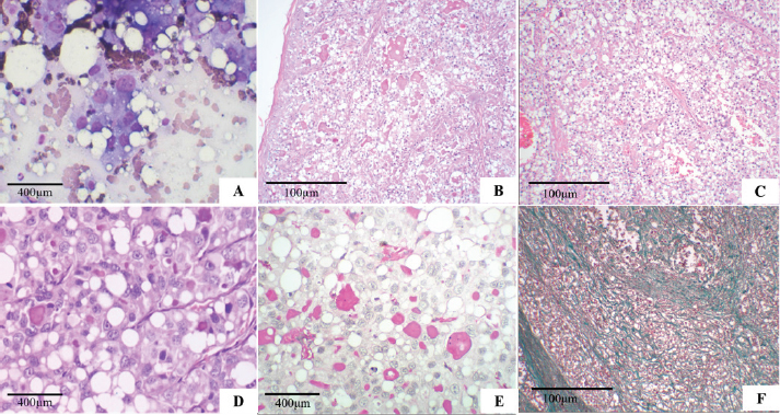 Fig. 1. Secretory carcinoma of the canine mammary gland. (A): Fine-needle aspiration cytology. There is high cellularity consisting of multidimensional groups of cells, sometimes isolated, with vacuolar cytoplasm, possibly containing amorphous pink material; large, round to ovoid nuclei, with marked anisocariosis, frequent karyomegaly (Diff-Quik, 100×). (B): Histopathology. Cells in solid arrangement with eosinophilic secretion (HE, 100×). (C): Histopathology of mammary gland carcinoma showing well-vascularized and fibrocollagenous stroma (HE, 100x). (D): Histopathology of mammary gland carcinoma showing cells with vacuolar cytoplasm, round nucleus displaced to the periphery (signet ring appearance), and prominent nucleoli (HE, 400×). (E): Histopathology. Evidence of abundant cytoplasmic vacuoles and containing homogeneous secretion material, positive with PAS (PAS, 400×). (F): Histopathology. Green stained fibrocollagenous stroma (Gomori trichrome, 100×). Macroscopically, the mammary tumor measured 8.1 × 3.9 × 4.9 cm. When cut, the mammary tumor had a solid, multinodular surface, and was whitish with multifocal to reddish coalescent areas. The mass in the proximal region of the humerus, measuring 6.6 × 5.3 × 5.7 cm, had characteristics similar to the breast mass. When cut, the mass exhibited a multinodular aspect with creaky areas and bone infiltration. The right inguinal, axillary, and left superficial cervical lymph nodes presented extensive white and firm nodular areas when cut. The histopathological examination of the four fragments showed that the mammary tumor consisted of a multilobular neoformation, was poorly delimited and infiltrative with variable and well-vascularized fibrocollagenous stroma, and was organized in solid, tubular areas with luminal spaces filled with eosinophilic secretion (Fig. 1B and C). The mammary tumor was constituted by cells with moderate and vacuolated cytoplasm, variable nucleus: cytoplasm ratio, round to oval nucleus that was central, but often peripheral (signet-ring appearance) (Fig. 1D) with loose chromatin, single to multiple, and prominent nucleoli. Marked anisocytosis and anisocariosis, marked cell and nuclear pleomorphism; seven mitotic figures in 2.37 mm² (Meuten et al., 2017). We frequently observed intracytoplasmic and extracellular homogeneous eosinophilic material positive for PAS (Fig. 1E), in addition to areas of hemorrhage and intratumoral coagulative necrosis. In the gomori trichrome, collagen was stained in green (Fig. 1F). Extensive areas of neoplastic infiltration were observed in the axillary and inguinal lymph nodes, in the subcapsular and medullary sinuses, consisting of the same cells observed in the mammary tumor, characterized as metastases of carcinoma. The mass in the proximal region of the humerus was characterized by multilobular neoplastic cell proliferation, which infiltrated the musculature and adjacent bone tissue with characteristics similar to those observed in the breast mass. Such morphological characteristics are consistent with the diagnosis of mammary gland secretory carcinoma, grade II, according to the histological grading system of Elston and Ellis (Elston and Ellis, 1991), with metastases in the analyzed lymph nodes and bone. For the IHC reaction of mammary cancer, cytokeratin AE1/AE3 1:500 (Dako®), oestrogen receptor (ER–Clone EP1) ready-to-use (Dako®), progesterone receptor (PR–Clone hRP a2) 1:50 (Invitrogen®), Ki-67 (MIB-1) 1:50 (Dako®), and alpha-lactalbumin (polyclonal) 1:500 (Invitrogen®) were used. Blocking of endogenous peroxidation and non-specific proteins was performed with a commercial solution of the Novolink® system (Leica Biosystems Newcastle Ltd., UK) according to the manufacturer’s recommendations, and the recommendations proposed by the consensus on the diagnosis, prognosis, and treatment of canine and feline mammary tumors (Cassali et al., 2019). For ER and PR, >10% nuclear labeling was considered positive, Ki-67 was evaluated in at least 1,000 neoplastic cells in high-power (400X) fields, and nuclear labeling>20% was considered positive, and alpha-lactalbumin with cytoplasmic and secretory labeling. The obtained positive membrane and cytoplasmic immunostaining for cytokeratin (Fig. 2A), Ki-67 in 40% of cells (Fig. 2B), alpha-lactalbumin positively labeled the cytoplasm and secretion (Fig. 2C), ER was negative (Fig. 2D), PR was positive in >75% (++++) (Fig. 2E). After surgery and histopathological diagnosis, two chemotherapy sessions were performed with a combination of carboplatin (10–10 mg/kg) and gemcitabine (200–200 mg/m²), with an interval of 1 week between sessions. 1 month after the surgery, the clinical condition worsened, with refractory pain in the region of the amputation scar, and euthanasia was elected, accounting for 133 days of survival after surgical removal of the tumor. The animal was autopsied after euthanasia, and samples were collected from the lungs, liver, kidneys, adrenals, spleen, pancreas, heart, intestine, and brain; however, there were no findings of metastasis or recurrence of the breast mass. Ethical approvalThe data used in this manuscript were obtained from Prof. Ricardo Alexandre Hippler of the Veterinary Hospital at Universidade Vila Velha (ES, Brazil). This case was part of routine clinical practice. The necropsy and study protocols were approved by the owner and hospital, and all procedures were performed by institutional guidelines (Universidade Vila Velha). DiscussionSecretory carcinoma is a special type of mammary gland tumor (Gamba et al., 2017) with an overall incidence of less than 0.15% in humans (Banerjee et al., 2021). In dogs, (Gamba et al., 2017), only one case has been reported to date (Cassali et al., 1999), in addition to that described in this study. In women, breast secretory carcinoma has a good prognosis with a low incidence of lymph node metastasis of only 30%, and distant metastases are also infrequent (Vas