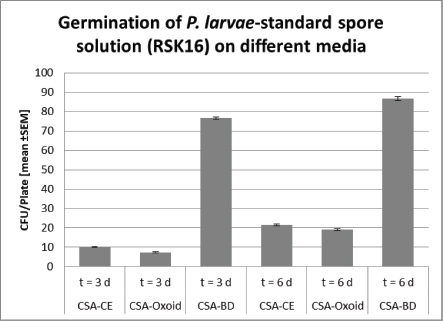 Ethical approvalAll experiments were performed according to actual ethical guidelines. Results and DiscussionTraditionally, monitoring of AFB is based on the observation of clinical symptoms within the apiary and microbial cultivation of P. larvae from honey, food, and brood samples (De Graaf et al., 2006). All cultivation protocols for the detection of sub-clinical levels of the pathogen include a heat treatment of the samples to reduce contamination and to stimulate the germination of P. larvae spores (Forsgren et al., 2008). Moreover, Nalidixid Acid can be used to avoid the growth of Gram-negative bacteria (Amtliche Methodensammlung, 2017). In our process, we reduced Gram-negative contaminants by a sample-processing step at 95°C. However, differences in heat resistance and germination rate of spores, as well as variation in proliferation among different P. larvae genotypes and strains may lead to a biased diagnose and disease monitoring (Forsgren et al., 2008). Not surprisingly, a high variability of bacterial plate counts from infected colonies has been reported (von der Ohe et al., 1997a, 1997b). Since selection of the growth media may also influence quantification of the pathogen (Nordström and Fries, 1995), we compared the germination of P. larvae spores on CSA, because of its ready-to-use disposability, instead of other media like MYPGP. Three different CSA without Nalidixid Acid were tested for its sensitivity against P. larvae. Therefore, we used freshly prepared CSA-LAVES and purchased CSA-Oxoid and CSA-BD plates, respectively (Fig. 1). The average germination rate of P. larvae DSM 17237 spores (RSK 16 standard) revealed moderate differences on CSA-LAVES (n=123) and CSA-Oxoid (n=120) after 3 and 6 days, respectively. After 3 days of incubation germination on CSA-LAVES (10.1 ±0.33 cfu/plate) and CSA-Oxoid (7.39 ± 0.27 cfu/plate) plates differed by factor 0.7 (p=1.44 × 10–9). In contrast, the bacterial plate counts on CSA-BD (n=120) were much higher at both time points. Germination on CSA-LAVES and CSA-BD (76.32 ± 0.68 cfu/plate) plates differed by factor 7.6 (p < 2.2 × 10–16) (Fig. 1). After 6 days of incubation CSA-LAVES (21.49 ±0.44 cfu/plate) and CSA-Oxid (19.19 ± 0.41 cfu/plate) differed by factor 0.9 (p=1.71 × 10–4), whereas CSA-LAVES and CSA-BD (86.61 ± 1.05 cfu/plate) differed by factor 4 (p < 2.2 × 10–16) (Fig. 1). The moderate differences between CSA-LAVES and CSA-Oxoid may be explained with the fresh sheepblood used for CSA-LAVES or the age of the purchased agar plates. However, the efficient germination and growth rate on CSA-BD suggests that additional ingredients of this complex medium are responsible for the marked difference. This is supported by our observation that cfu values of P. larvae on CSA-LAVES and CSA-Oxoid media are increasing over a time period of 6 days, while significantly higher cfu values on CSA-BD are already present after 3 days of cultivation. Thus, the faster and higher germination and growth rate after only 3 days suggests CSA-BD for a time-optimized protocol. To timely verify culture-based identification of P. larvae strains and to differentiate between the epidemiologically prevalent P. larvae genotypes ERIC I and II, we developed and optimized a multiplex qPCR. With this protocol P. larvae reference strains (DSM 7030 ERIC I, DSM 25430 ERIC II) and 40 field isolates could be confirmed based on the amplification of the 16S rRNA target sequence (Cq-value ≤ 30) (Table 1), while no amplicons were detected for P. alvei (no Cq) and the NTC (Cq-value > 30). Similarly, PCR products of the ItuC target gene were detected for all P. larvae reference strains and field isolates (Cq-value ≤ 30). The NTC showed no Cq and P. alvei resulted in Cq-values greater or equal 35. Since P. larvae genotypes ERIC I and II differ in their virulence gene repertoir (Fünfhaus et al., 2013; Djukic et al., 2014; Sood et al., 2014; Ebeling et al., 2016), we utilized the ERIC I specific AB toxin Plx1 gene to discriminate between them in our mqPCR approach. As shown in Table 1, target sequence plx1.3 was only detected in P. larvae DSM 7030 (Cq ≤ 30) and the field isolates of genotype ERIC I. Paenibacillus larvae DSM 25430 and all field isolate of genotype ERIC II were negative for plx1.3, whereas the Cq-values of the NTC and P. alvei were greater or equal 35. Thus, together with the results for the 16S rRNA and ItuC target sequences P. alvei can clearly be excluded and ERIC genotypes I and II of P. larvae be distinguished.