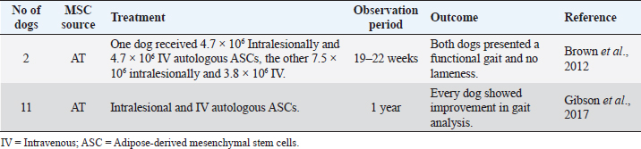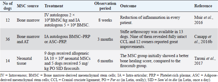 Table 6. Preclinical trials carried out with MSCs in canine stifle OA.