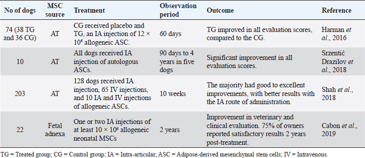 Regarding MSCs source, the most commonly used in veterinary medicine are AT and BM. None of these studies has demonstrated the superiority of one cell source over another. However, stem cells derived from AT were the most used by the authors, probably due to their easier extraction, namely in elective ovariohysterectomy. MSCs therapy can be autologous/allogeneic or xenogeneic depending on whether stem cells are obtained, respectively, from the same animal, same species donor or from different species. Two studies regarding canine OA treatment have used xenogeneic MSCs from porcine or horses, reporting excellent results with no severe adverse effects in none of the dogs (Tsai et al., 2014; Daems et al., 2019). Regarding the routes of administration, the one that is preferentially selected is the injection of MSCs directly at the injury site. Experimental studies support the greater effectiveness of the intralesional route of administration when comparing to others. Intra-articular injection of ASCs is the most commonly reported route to deliver cells into the damaged cartilage; however, in most cases, it requires anesthesia or sedation, and synovial fluid from arthritic joints is reported to be cytotoxic to cultured MSCs (Kiefer et al., 2015). Therefore, new protocols with the intravenous route have been developed. The intravenous administration of MSCs promotes a better interaction with the immune system, which may lead to systemic anti-inflammatory effects and reduce pain at multiple sites. However, despite the attraction of MSCs to the injured areas by the intravenous route, its effectiveness was reported to be low in some studies (Eggenhofer et al., 2014; De Becker and Van Riet, 2016). Shah et al. (2018) compared ASC therapy by different administration routes in dogs with OA. They realized that the intra-articular way had better improvements than the intravenous one. Olsen et al. (2019) studied the effect of ASCs by intravenous route in dogs with OA. Despite the improvement in clinical outcome, subjective outcome measures (such as OA biomarkers in synovial fluid) did not confirm similar progress. These results reveal the need for larger samples sizes and CGs to interpret the outcomes and more research before intravenous MSCs becomes a therapeutic option for dogs with OA. It is necessary to increase our knowledge of the MSC migration process to improve it. According to previous studies, it has been reported that treatment with ASC or BMSC in combination with PRP or PRGF improves clinical signs, reducing lameness and providing notable recovery of previous limited sports activities (Cuervo et al., 2014). The effect of PRP is due to the behavior of the platelet concentrate, acting as a scaffold which, through the release of growth factors (such as TGF-β, fibroblast growth factor and IGF-1), promotes the stimulation of chondrogenesis, increases hyaluronic acid production, promotes angiogenesis, and differentiation of the existing cells in the treated area (Cuervo et al., 2014; Upchurch et al., 2016). The PRGF is considered a better choice by some authors due to the optimal concentration of platelets and absence of white blood cells (Nishiyama et al., 2016). Cuervo et al. (2014) demonstrated that a single IA injection of ASCs is significantly more effective than one IA injection of PRGF. Therapy with PRGF alone showed similar improvements as ASC in the first month post-treatment. However, better results were observed in the long term in patients with ASCs. Other studies had great results in the combination therapy: MSCs with PRP or PRGF (Cuervo et al., 2014; Canapp et al., 2016c; Mcdougall et al., 2018). MSCs therapy with specific concomitant medication proved detrimental to treatment, particularly with NSAIDs, generally used for these conditions. Shah et al. (2018) studied allogeneic ASC therapy in dogs with OA, reporting only one case that did not respond to the treatment and had shown worsening of the condition. This dog was the only one receiving NSAIDs therapy at the same time as MSCs therapy. Most studies did not include immunohistochemistry, immunofluorescence, and histopathology to confirm that MSCs have differentiated and/or incorporated into the injured tissues. Further studies will be needed to definitely prove stem cell differentiation and engraftment. However, their initial cell-to-cell contact and cytokine release effect seems to be the most significant therapeutic impact of these cells. ConclusionMSCs have been shown to have an excellent potential for orthopedic therapy in dogs, especially for OA, where all studies presented promising results. This therapy has shown no evident adverse effects, even with its allogeneic administration, making them a safe and promising therapeutic option. The main obstacles to this therapy are the inconsistency of protocols applied to date, the small samples used for clinical trials, patient variability, and the follow-up time of cases after therapy. Besides, it should be noted that cell therapies in veterinary patients are not strictly supervised by regulatory agencies in most countries. There is an urgent need for health agencies, national and across borders, such as European Medicines Agency (EMA), to define and regulate the standardization and criteria for the safe and efficient application of these therapeutic approaches. Future trials should have more homogeneous and larger samples, predefined standardized stem cell protocols for treatment groups, presence of CGs, and continue data collection for more extended periods (more than 6 months) for appropriate long-term conclusions. Currently, therapy based on MSCs requires, more than ever before, a thorough analysis and consideration in the hope of overcoming its limitation in upcoming trials. AcknowledgmentsThis research was funded by National Funds by FCT (Portuguese Foundation for Science and Technology) under the project UIDB/AGR/04033/2020. Conflict of interestP.P.C. declares to be the fo