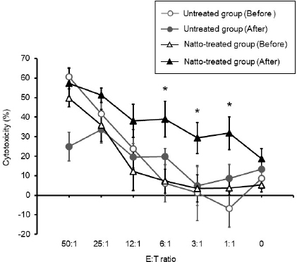 Fig. 2. Cytotoxicity against CTAC cells mediated by PBMC. The cytotoxicity of the PBMCs collected from the untreated group of dogs had no significant change between before and after administration. On the contrary, there was a significant increase in the PBMC cytotoxicity of the natto-treated group after administration when compared to that before administration at E:T ratios of 6:1, 3:1, and 1:1. Before: before administration, after: after administration. Data represent mean ± SE. *p < 0.05 versus before administration.