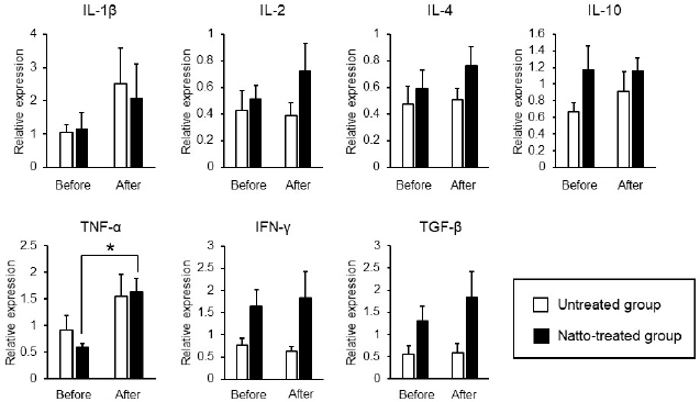 Fig. 3. Expression levels of inflammatory cytokines in antigen-stimulated PBMCs. PBMCs were incubated in a culture medium containing 25 ng/ml of PMA and 1 μg/ml of ionomycin for 6 hours. Relative expression levels of the target genes were normalized against β-actin and calculated by the 2-ΔΔCT method. Values were standardized to those of a dog in the untreated group. Before: before administration, after: after administration. Data represent mean ± SE. *p < 0.05 versus before administration. Expression of TNF-α by the PBMCs had significantly increased after oral administration of natto in this study (Fig. 3). A past study demonstrated that levan induced the production of TNF-α in a murine macrophage cell line in vitro (Xu et al., 2006). Thus, the upregulation of TNF-α by the PBMCs, as observed in our results, might be caused by levan contained in the freeze-dried natto product. TNF-α is cytotoxic to tumor cells (Aggarwal, 2003). On the other hand, recent studies have revealed proinflammatory effects and paradoxical immunoregulative effects of TNF-α (Salomon et al., 2018). Owing to its pleiotropic effects, apparent implications of the elevated expression levels of TNF-α in PBMCs in our study remains unclear. Nevertheless, considering the enhanced cytotoxicity of NK cells due to TNF-α (Maki et al., 1998), the increased expression of TNF-α induced by the natto treatment might potentiate cellular immune activity in dogs. We conclude that oral administration of natto augments cellular immune activity in dogs through an elevation in the number of peripheral blood NK cells and an enhancement of their cytotoxic effects. Our results suggest that the administration of natto might be beneficial adjuvant therapy for dogs with neoplastic diseases. AcknowledgmentThe authors would like to thank the staff and students of Okayama University of Science Specialized Training College for the care they provided to the dogs. Conflict of interestThe authors declare that there is no conflict of interests. Authors’ contributionsAM, SA, and HK planed the experimental design of this study. SM, AM, and YK carried out the experiments. SM and AM analyzed the data. AM wrote the first draft. All authors wrote and revised the article and approved the final manuscript. ReferencesAggarwal, B.B. 2003. Signalling pathways of the TNF superfamily: a double-edged sword. Nat. Rev. Immunol. 3(9), 745–756. Ashraf, R. and Shah, N.P. 2014. Immune system stimulation by probiotic microorganisms. Crit. Rev. Food Sci. Nutr. 54, 938–956. Dang, X., Xu, M., Liu, D., Zhou, D. and Yang, W. 2020. Assessing the efficacy and safety of fecal microbiota transplantation and probiotic VSL#3 for active ulcerative colitis: a systematic review and meta-analysis. PLoS One. 15, e0228846. Friedenberg, S.G., Brown, D.L., Meurs, K.M. and Law, J.M. 2018. Lymphocyte subsets in the adrenal glands of dogs with primary hypoadrenocorticism. Vet. Pathol. 55, 177–181. Fujisawa, T., Shinohara, K., Kishimoto, Y. and Terada, A. 2006. Effect of miso soup containing Natto on the composition and metabolic activity of the human faecal flora. Microb. Ecol. Health. Dis. 18, 79–84. Gong, L., Huang, Q., Fu, A., Wu, Y.P., Li, Y., Xu, X., Huang, Y., Yu, D. and Li, W. 2018. Spores of two probiotic Bacillus species enhance cellular immunity in BALB/c mice. Can. J. Microbiol. 64, 41–48. Goto, K., Iwasawa, D., Kamimura, Y., Yasuda, M., Matsumura, M. and Shimada, T. 2011. Clinical and histopathological evaluation of Dermatophagoides farinae-induced dermatitis in NC/Nga mice orally administered Bacillus subtilis. J. Vet. Med. Sci. 73, 649–654. Hammond, J.A., Guethlein, L.A., Abi-Rached, L., Moesta, A.K. and Parham, P. 2009. Evolution and survival of marine carnivores did not require a diversity of killer cell Ig-like receptors or Ly49 NK cell receptors. J. Immunol. 182, 3618–3627. Huang, Y.C., Hung, S.W., Jan, T.R., Liao, K.W., Cheng, C.H., Wang, Y.S. and Chu, R.M. 2008. CD5-low expression lymphocytes in canine peripheral blood show characteristics of natural killer cells. J. Leukoc. Biol. 84, 1501–1510. Kim, T.W., Lee, T.Y., Bae, H.C., Hahm, J.H., Kim, Y.H., Park, C., Kang, T.H., Kim, C.J., Sung, M.H. and Poo, H. 2007. Oral administration of high molecular mass poly-γ-glutamate induces NK cell-mediated antitumor immunity. J. Immunol. 179, 775–780. Lee, K., Hwang, S., Paik, D.J., Kim, W.K., Kim, J.M. and Youn, J. 2012. Bacillus-derived poly-γ-glutamic acid reciprocally regulates the differentiation of T helper 17 and regulatory T cells and attenuates experimental autoimmune encephalomyelitis. Clin. Exp. Immunol. 170, 66–76. Lee, S.H., Shin, D.J., Kim, Y., Kim, C.J., Lee, J.J., Yoon, M.S., Thanh Uong, T.N., Yu, D., Jung, J.Y., Cho, D., Jung, B.G., Kim, S.K. and Suh, G.H. 2018. Comparison of phenotypic and functional characteristics between canine non-B, non-T natural killer lymphocytes and CD3+ CD5dim CD21− cytotoxic large granular lymphocytes. Front. Immunol. 9, 1–15. Lee, T.Y., Kim, D.J., Won, J.N., Lee, I.H., Sung, M.H. and Poo, H. 2014. Oral administration of poly-γ-glutamate ameliorates atopic dermatitis in Nc/Nga mice by suppressing Th2-biased immune response and production of IL-17A. J. Invest. Dermatol. 134, 704–711. Maki, G., Krystal, G., Dougherty, F., Takei, F. and Klingemann, H.G. 1998. Induction of sensitivity to NK-mediated cytotoxicity by TNF-α treatment: possible role of ICAM-3 and CD44. Leukemia. 12, 1565–1572. Michael, H.T., Ito, D., McCullar, V., Zhang, B., Miller, J.S. and Modiano, J.F. 2013. Isolation and characterization of canine natural killer cells. Vet. Immunol. Immunopathol. 155, 211–217. Mitsui, N., Kajimoto, O., Tsukahara, M., Murasawa, H., Tamura, M., Nishimura, A., Kajimoto, Y. and Benno, Y. 2006. Effect of natto including Bacillus subtilis K-2 (Spore) on defecation and fecal microbiota, and safety of excessive ingestion in healthy volunteers. Jpn. Pharm. Ther. 34, 135–148. Oh, H.G., Kang, Y.R., Lee, H.Y