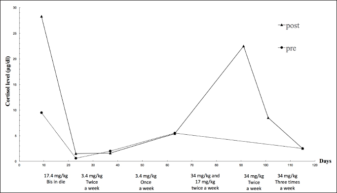 Fig. 1. Changes in mitotane dose and the serum cortisol levels examined by ACTH stimulating tests. The broken line and the solid line show the cortisol levels before and after ACTH stimulation respectively. The texts under the graph indicate the mitotane dose in each period. However, on day 197, the dog visited because of a severe decline both in appetite and activity, and the left eyeball protrusion. A physical examination revealed external strabismus and protrusion of the left eye and deformity of the fourth premolar to the jawbone. A Grade II/VI systolic murmurs were heard from the right chest wall and left basal portion of the heart. Chest echography revealed wart-like structures in the right atrium (Fig. 2D). Blood tests showed elevated white blood cell count (21,800/μl), elevated C-reactive protein (CRP) (3.7 mg/dl), and mildly elevated GPT (100 U/l). Based on blood tests and echography, the possibility that warts in the right atrium were complicated by bacterial endocarditis could not be ruled out, and there was a high possibility that the nasal discharge was likely due to a bacterial infection, so, enrofloxacin (Baytril, 5 mg/kg, PO, SID, Bayer Yakuhin, Ltd., Osaka, Japan) was prescribed. However, the nasal discharge remained severe and the symptoms of polydipsia recurred. No further treatment was desired by the owner. Finally, the dog died on day 280.